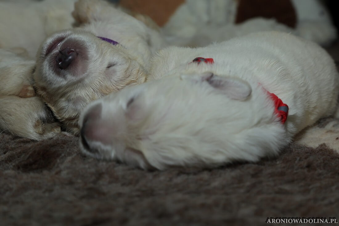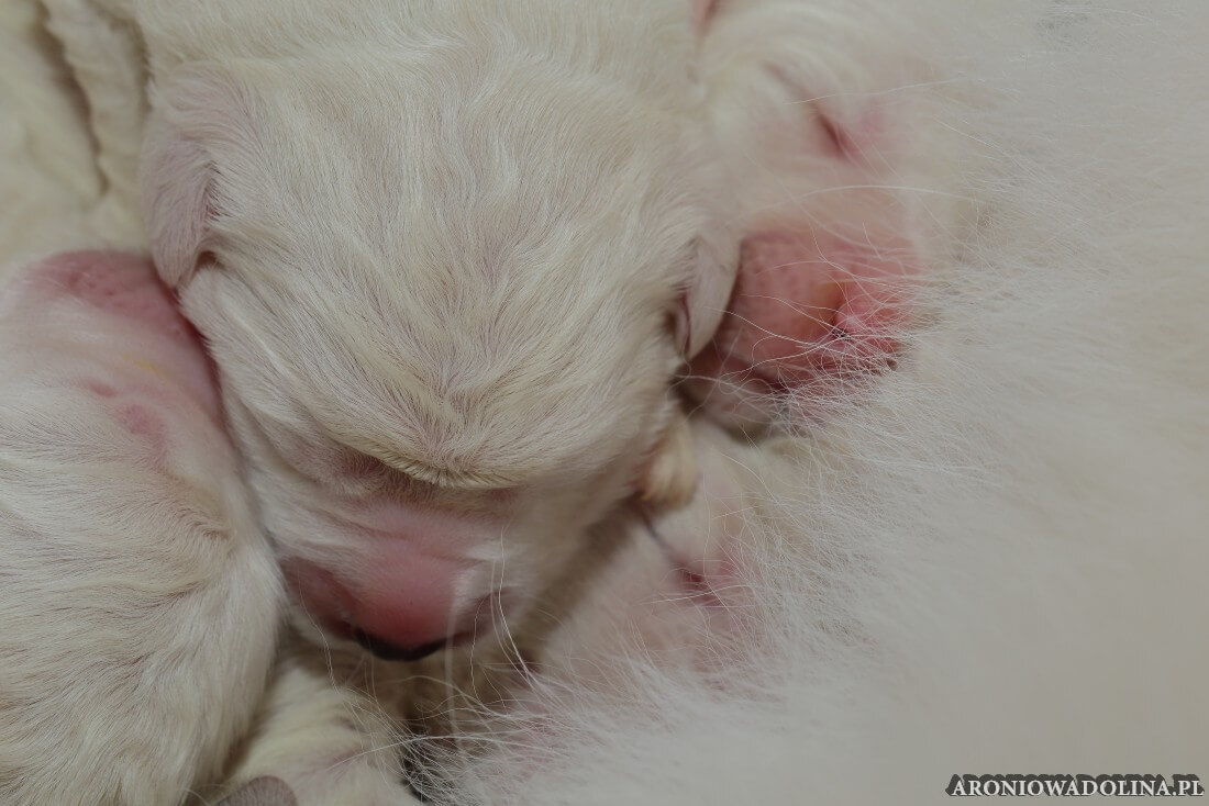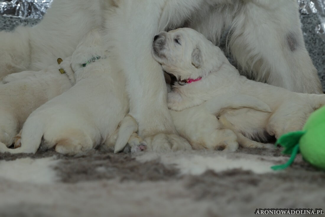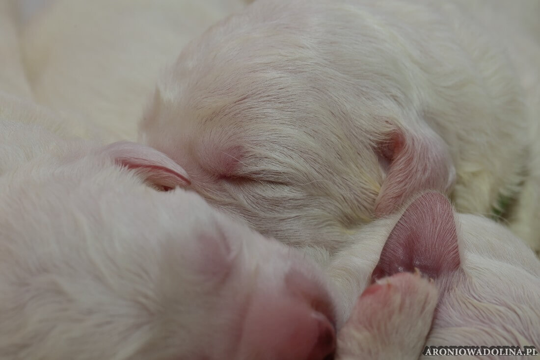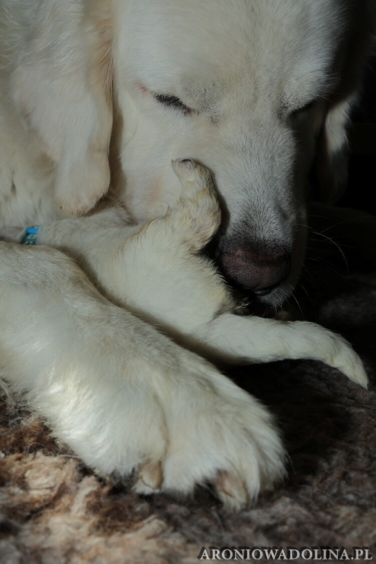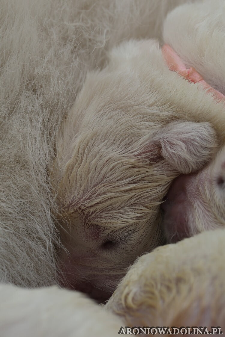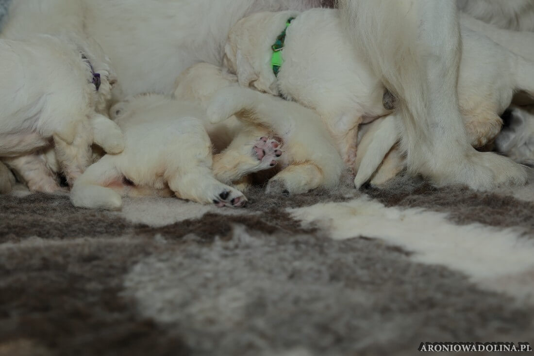W tym czasie szczeniaki owczarka podhalańskiego głównie śpią, budzą się żeby zjeść i załatwić i znowu śpią. Piwonia okazała się bardzo czułą mamą, wylizuje maluszki, zwłaszcza brzuszki i 4-literki, ponieważ samodzielnie jeszcze nie potrafią uruchomić swoich kiszeczek. Pod koniec tego okresu szczeniaczki zaczynają lekko otwierać oczka, próbują niezdarnie chodzić na łapkach, niektóre już poszczekują. Wybarwiają się im noski. Codziennie sprawdzamy wagę maluszków żeby kontrolować ich prawidłowy rozwój. Obcinamy pazurki żeby nie raniły Piwonii w trakcie karmienia (w odróżnieniu od kotków, pieski nie potrafią ich chować). I tak wchodzimy w 3. tydzień życia.