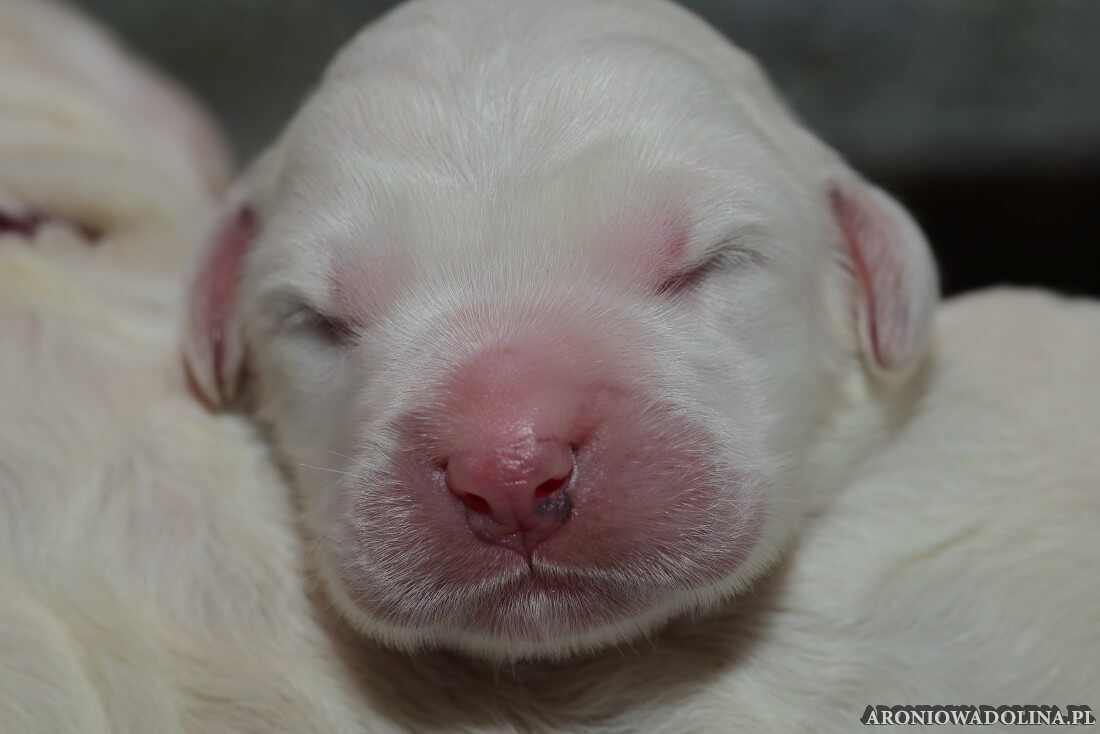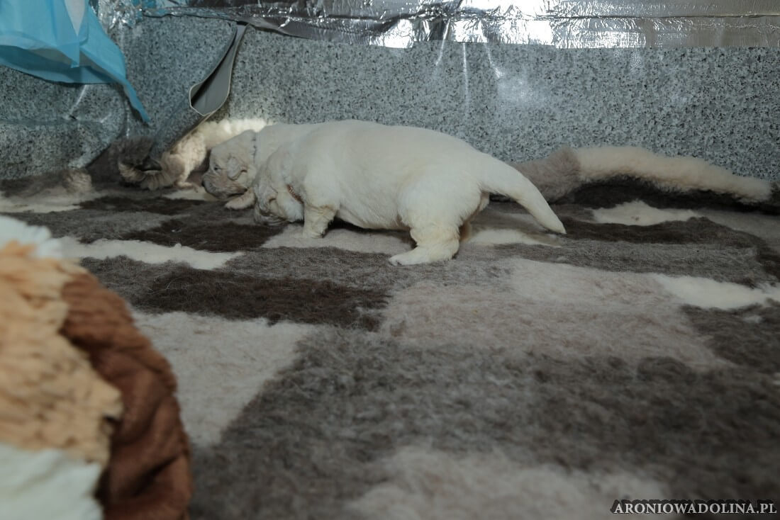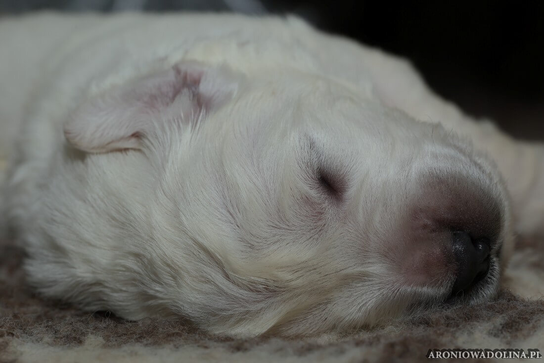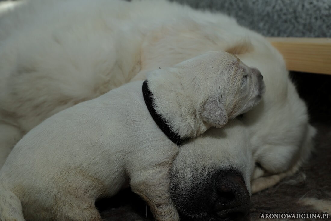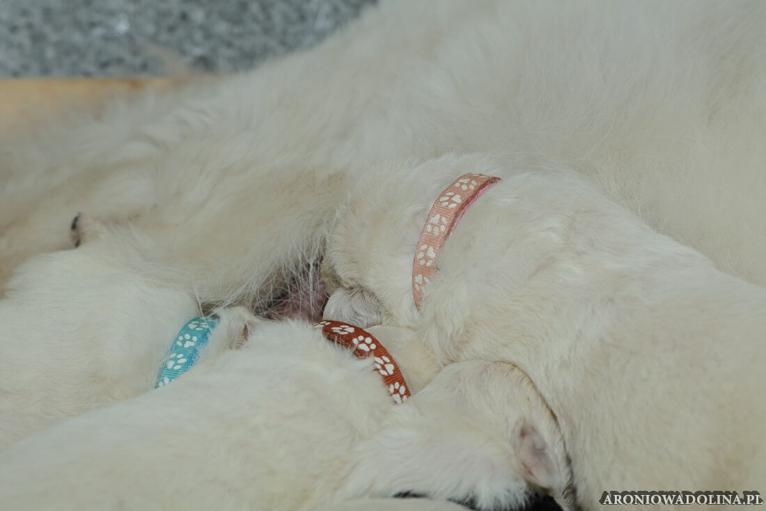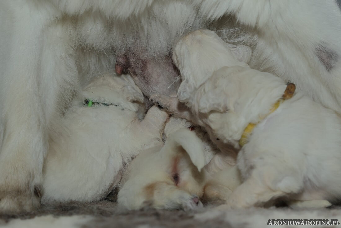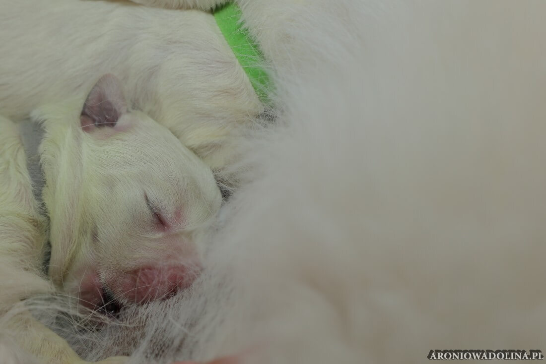 W tym czasie szczeniaki owczarka podhalańskiego głównie śpią, budzą się żeby zjeść i załatwić i znowu śpią. Piwonia okazała się bardzo czułą mamą, wylizuje maluszki, zwłaszcza brzuszki i 4-literki, ponieważ samodzielnie jeszcze nie potrafią uruchomić swoich kiszeczek. Pod koniec tego okresu szczeniaczki zaczynają lekko otwierać oczka, próbują niezdarnie chodzić na łapkach, niektóre już poszczekują. Wybarwiają się im noski. Codziennie sprawdzamy wagę maluszków żeby kontrolować ich prawidłowy rozwój. Obcinamy pazurki żeby nie raniły Piwonii w trakcie karmienia (w odróżnieniu od kotków, pieski nie potrafią ich chować). I tak wchodzimy w 3. tydzień życia.