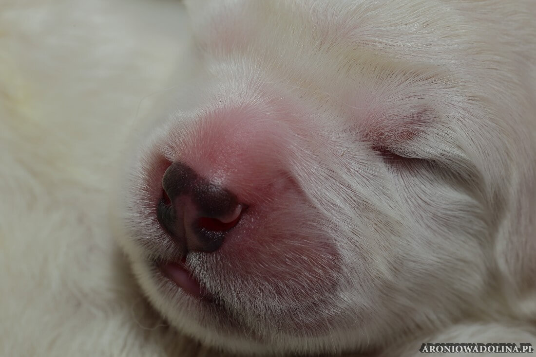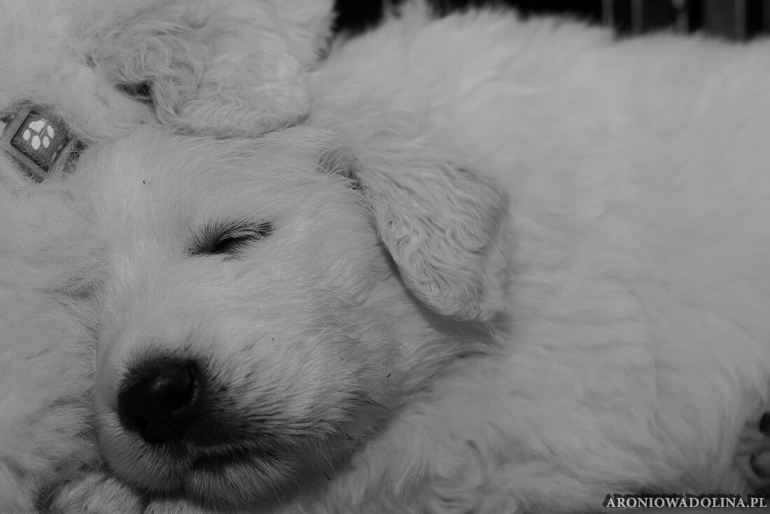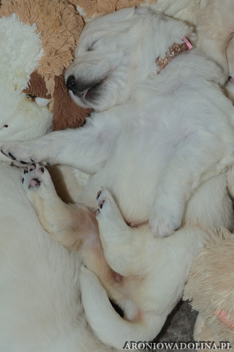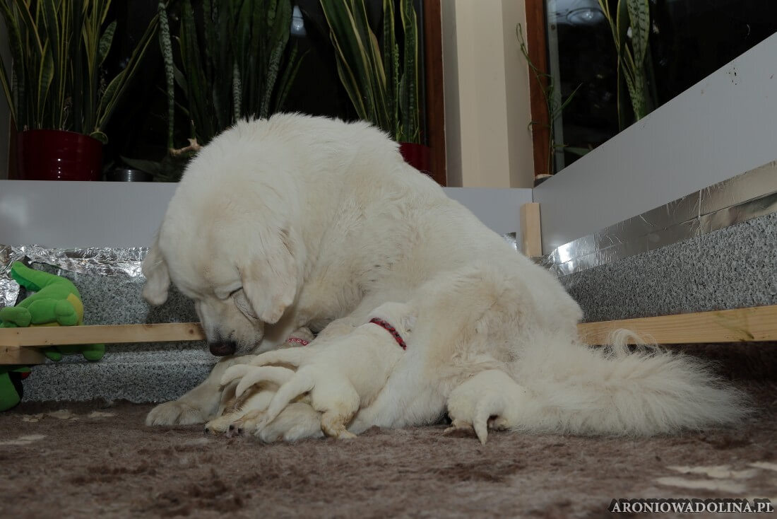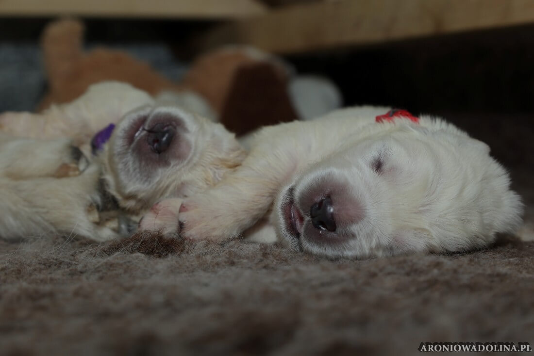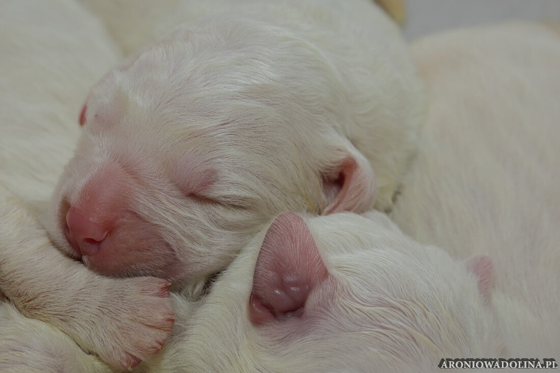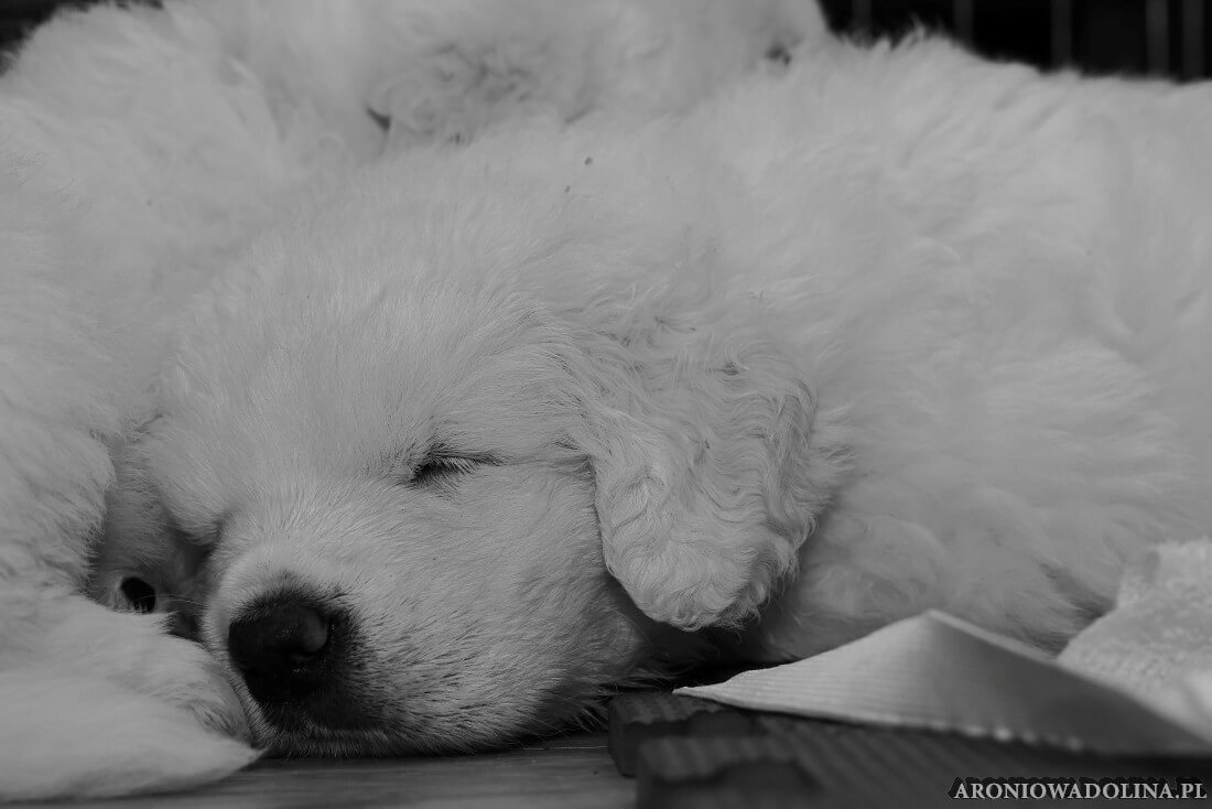W tym czasie szczeniaki owczarka podhalańskiego głównie śpią, budzą się żeby zjeść i załatwić i znowu śpią. Piwonia okazała się bardzo czułą mamą, wylizuje maluszki, zwłaszcza brzuszki i 4-literki, ponieważ samodzielnie jeszcze nie potrafią uruchomić swoich kiszeczek. Pod koniec tego okresu szczeniaczki zaczynają lekko otwierać oczka, próbują niezdarnie chodzić na łapkach, niektóre już poszczekują. Wybarwiają się im noski. Codziennie sprawdzamy wagę maluszków żeby kontrolować ich prawidłowy rozwój. Obcinamy pazurki żeby nie raniły Piwonii w trakcie karmienia (w odróżnieniu od kotków, pieski nie potrafią ich chować). I tak wchodzimy w 3. tydzień życia.