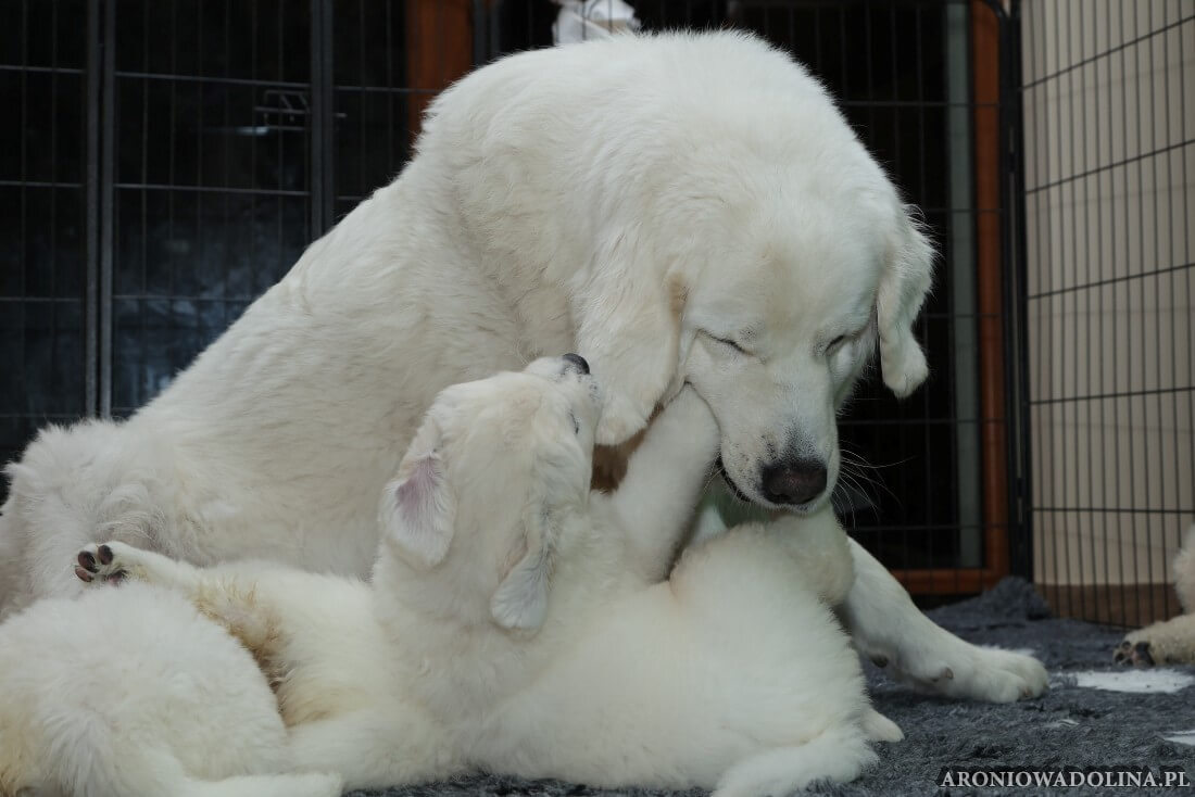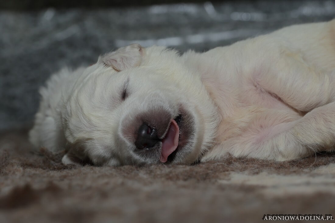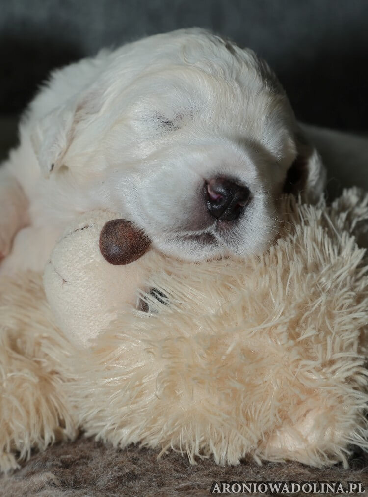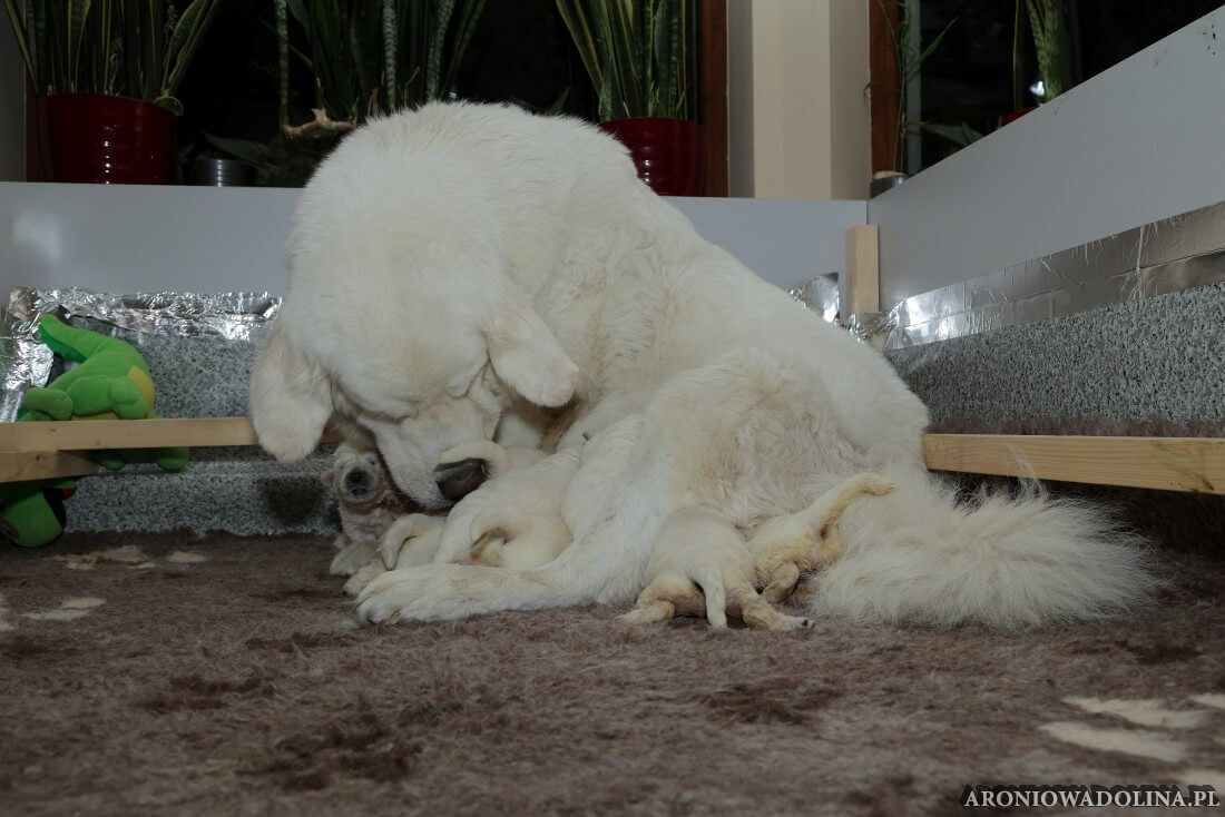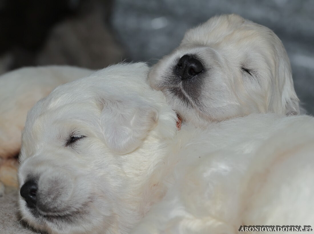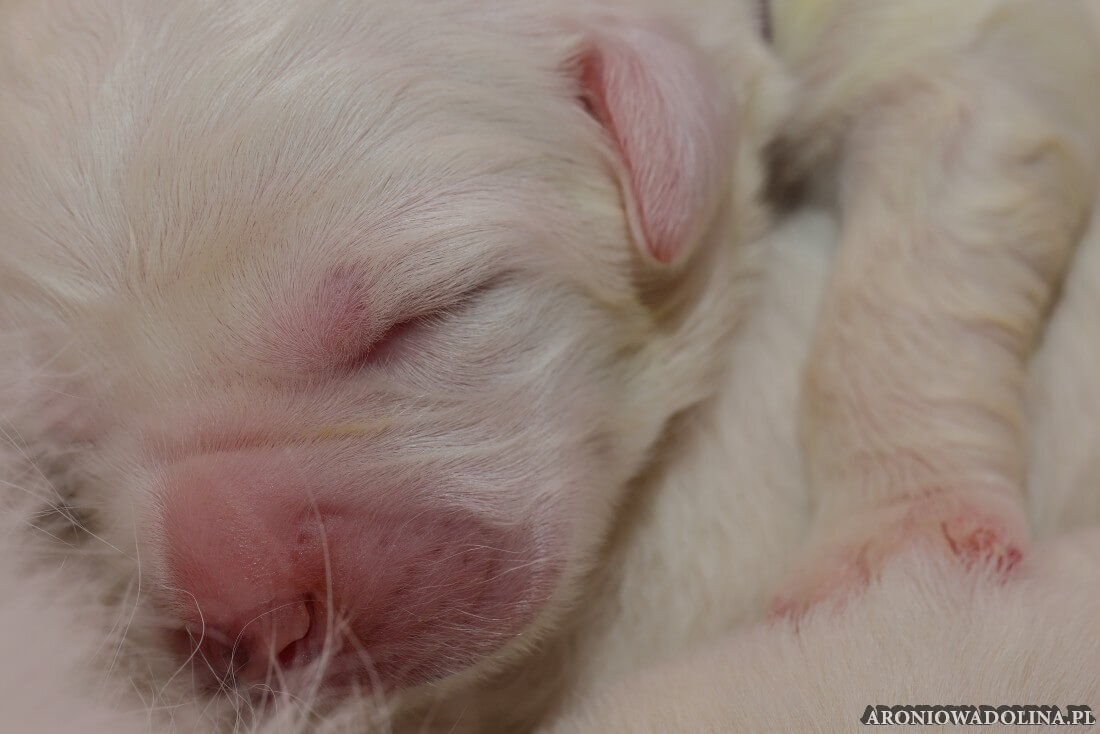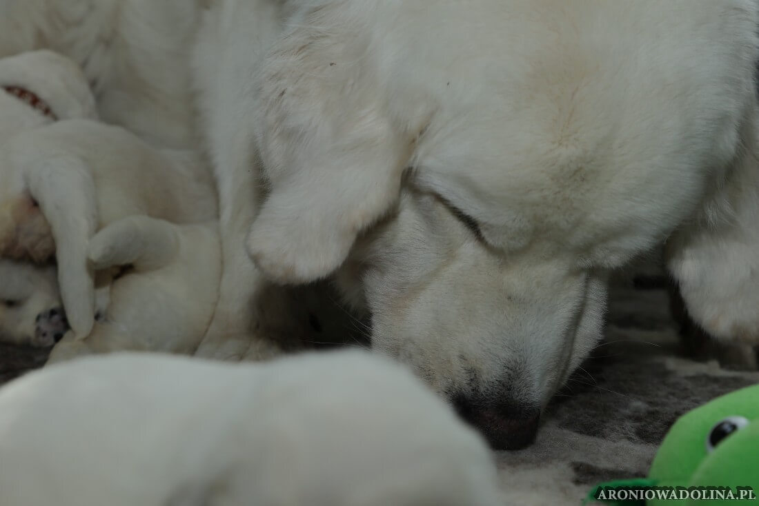 W tym czasie szczeniaki owczarka podhalańskiego głównie śpią, budzą się żeby zjeść i załatwić i znowu śpią. Piwonia okazała się bardzo czułą mamą, wylizuje maluszki, zwłaszcza brzuszki i 4-literki, ponieważ samodzielnie jeszcze nie potrafią uruchomić swoich kiszeczek. Pod koniec tego okresu szczeniaczki zaczynają lekko otwierać oczka, próbują niezdarnie chodzić na łapkach, niektóre już poszczekują. Wybarwiają się im noski. Codziennie sprawdzamy wagę maluszków żeby kontrolować ich prawidłowy rozwój. Obcinamy pazurki żeby nie raniły Piwonii w trakcie karmienia (w odróżnieniu od kotków, pieski nie potrafią ich chować). I tak wchodzimy w 3. tydzień życia.
