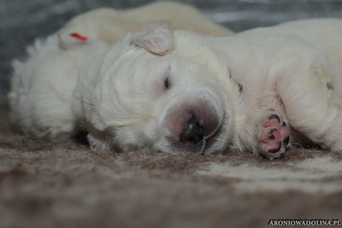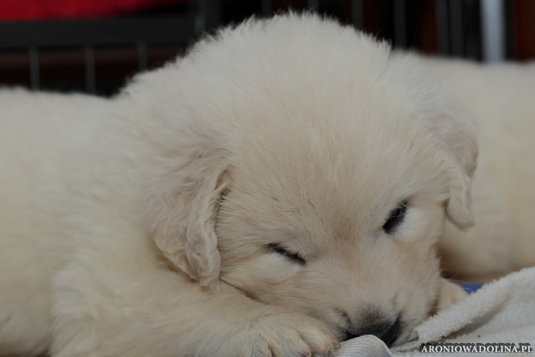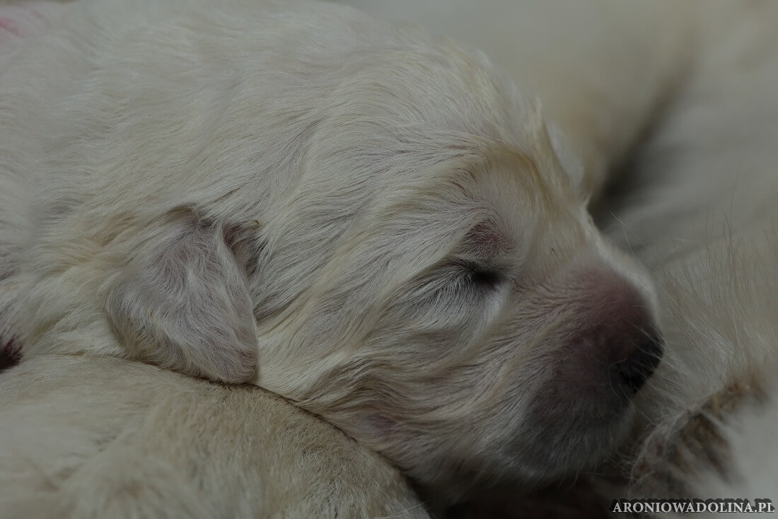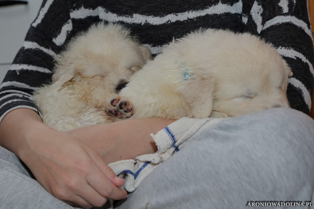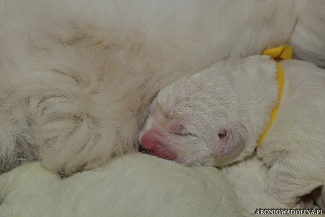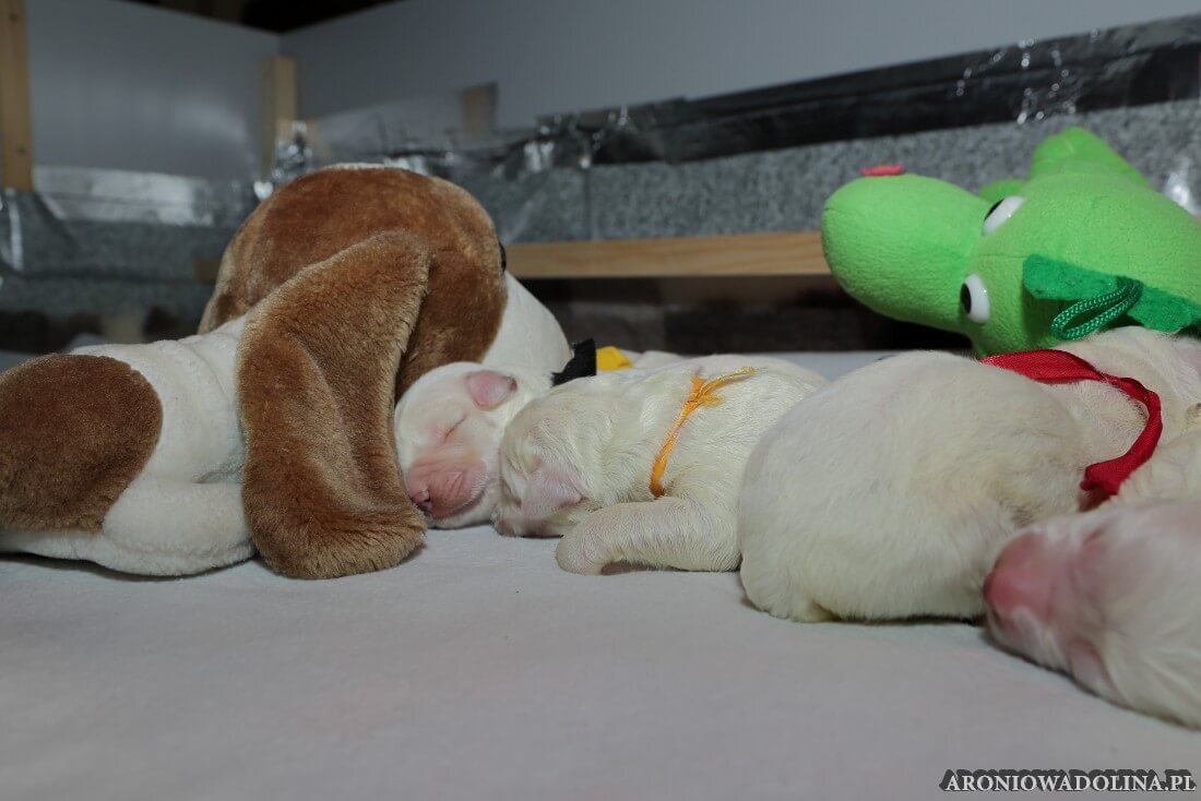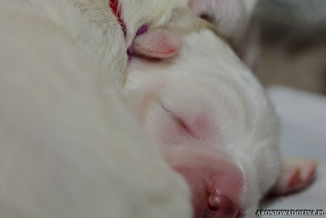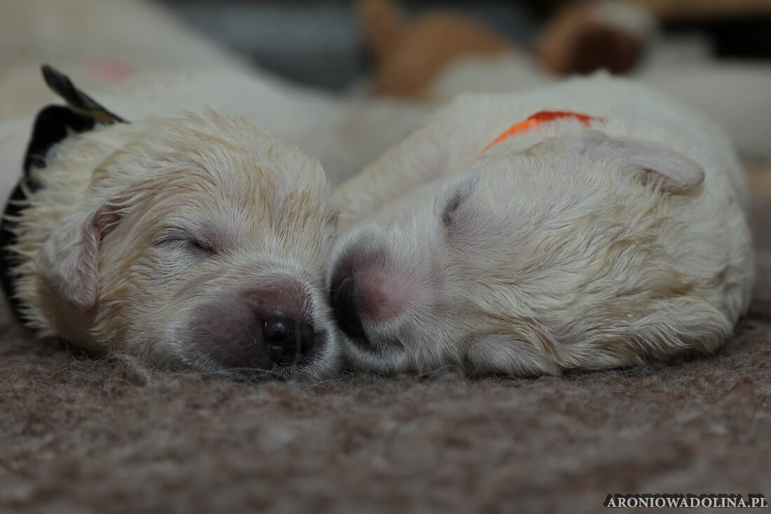 W tym czasie szczeniaki owczarka podhalańskiego głównie śpią, budzą się żeby zjeść i załatwić i znowu śpią. Piwonia okazała się bardzo czułą mamą, wylizuje maluszki, zwłaszcza brzuszki i 4-literki, ponieważ samodzielnie jeszcze nie potrafią uruchomić swoich kiszeczek. Pod koniec tego okresu szczeniaczki zaczynają lekko otwierać oczka, próbują niezdarnie chodzić na łapkach, niektóre już poszczekują. Wybarwiają się im noski. Codziennie sprawdzamy wagę maluszków żeby kontrolować ich prawidłowy rozwój. Obcinamy pazurki żeby nie raniły Piwonii w trakcie karmienia (w odróżnieniu od kotków, pieski nie potrafią ich chować). I tak wchodzimy w 3. tydzień życia.