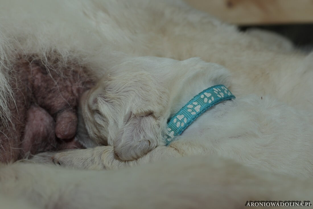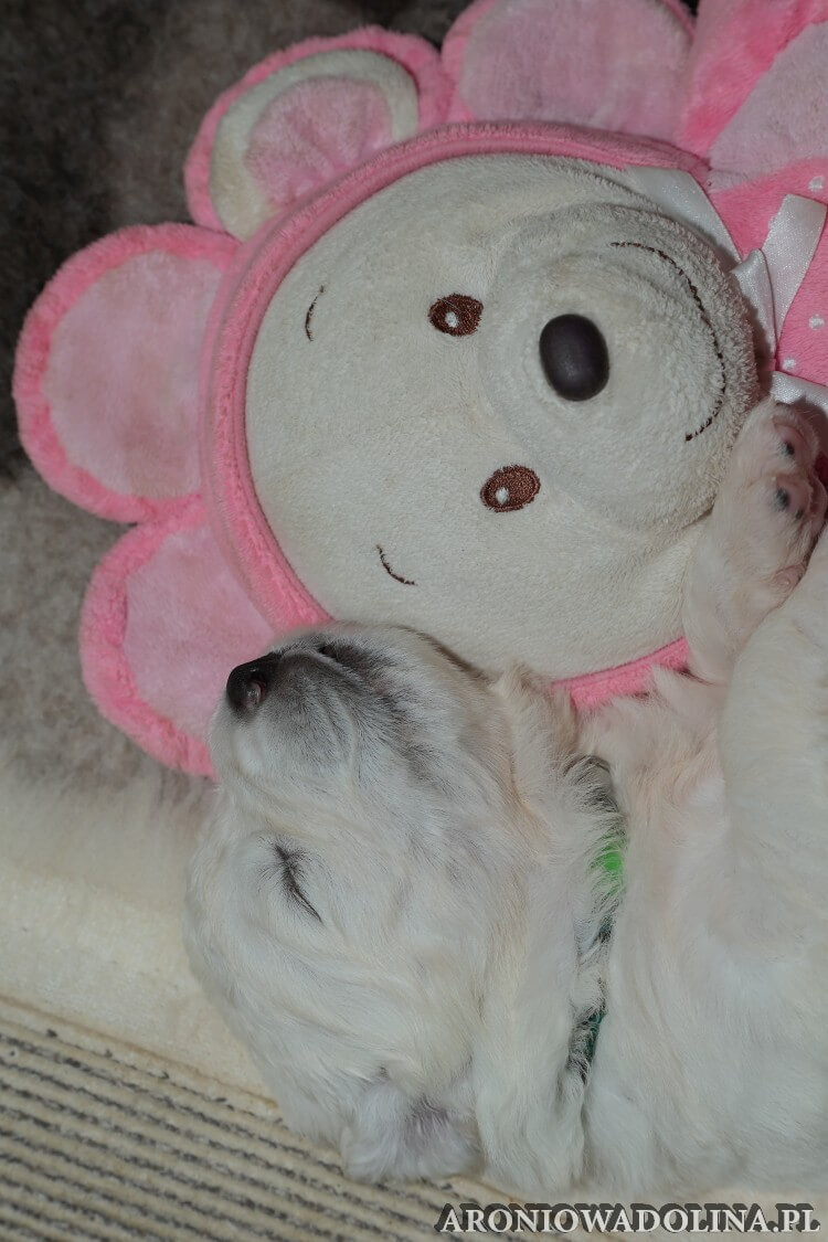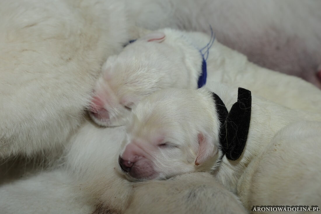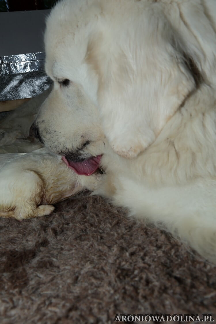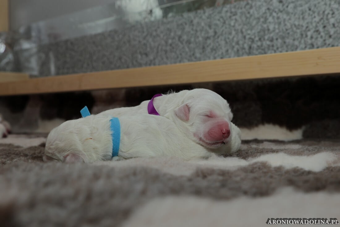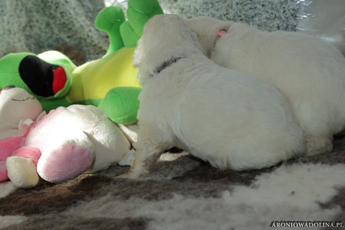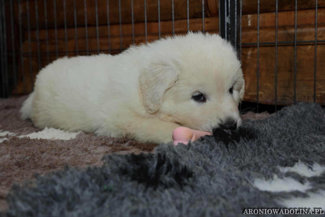 W tym czasie szczeniaki owczarka podhalańskiego głównie śpią, budzą się żeby zjeść i załatwić i znowu śpią. Piwonia okazała się bardzo czułą mamą, wylizuje maluszki, zwłaszcza brzuszki i 4-literki, ponieważ samodzielnie jeszcze nie potrafią uruchomić swoich kiszeczek. Pod koniec tego okresu szczeniaczki zaczynają lekko otwierać oczka, próbują niezdarnie chodzić na łapkach, niektóre już poszczekują. Wybarwiają się im noski. Codziennie sprawdzamy wagę maluszków żeby kontrolować ich prawidłowy rozwój. Obcinamy pazurki żeby nie raniły Piwonii w trakcie karmienia (w odróżnieniu od kotków, pieski nie potrafią ich chować). I tak wchodzimy w 3. tydzień życia.
