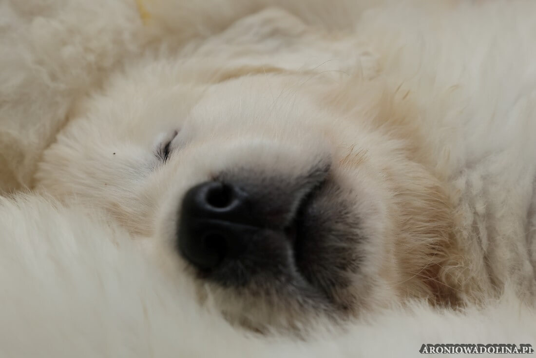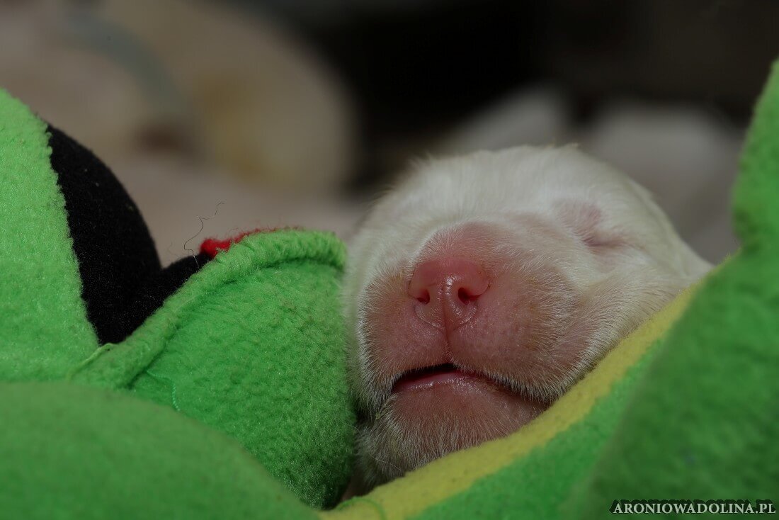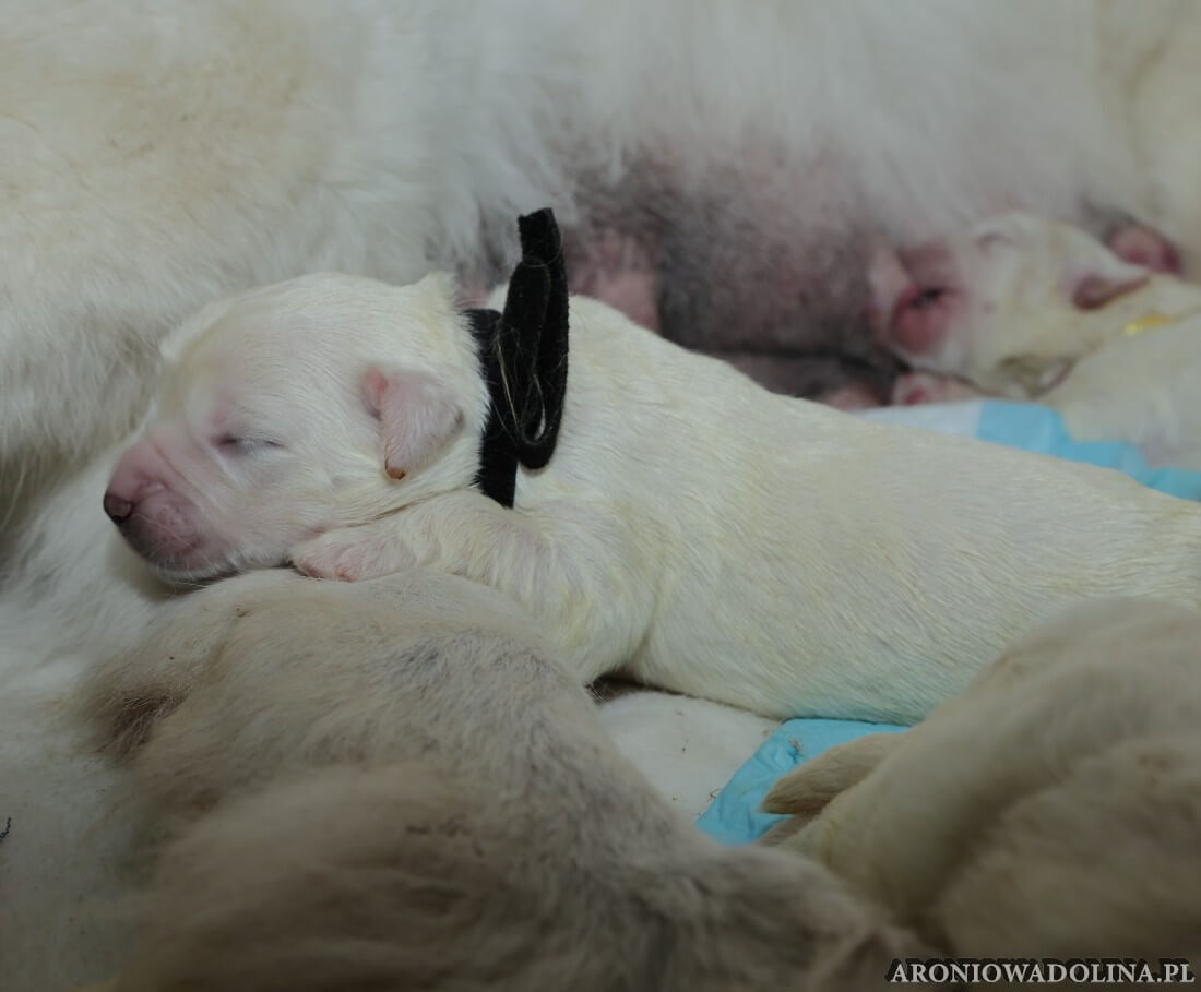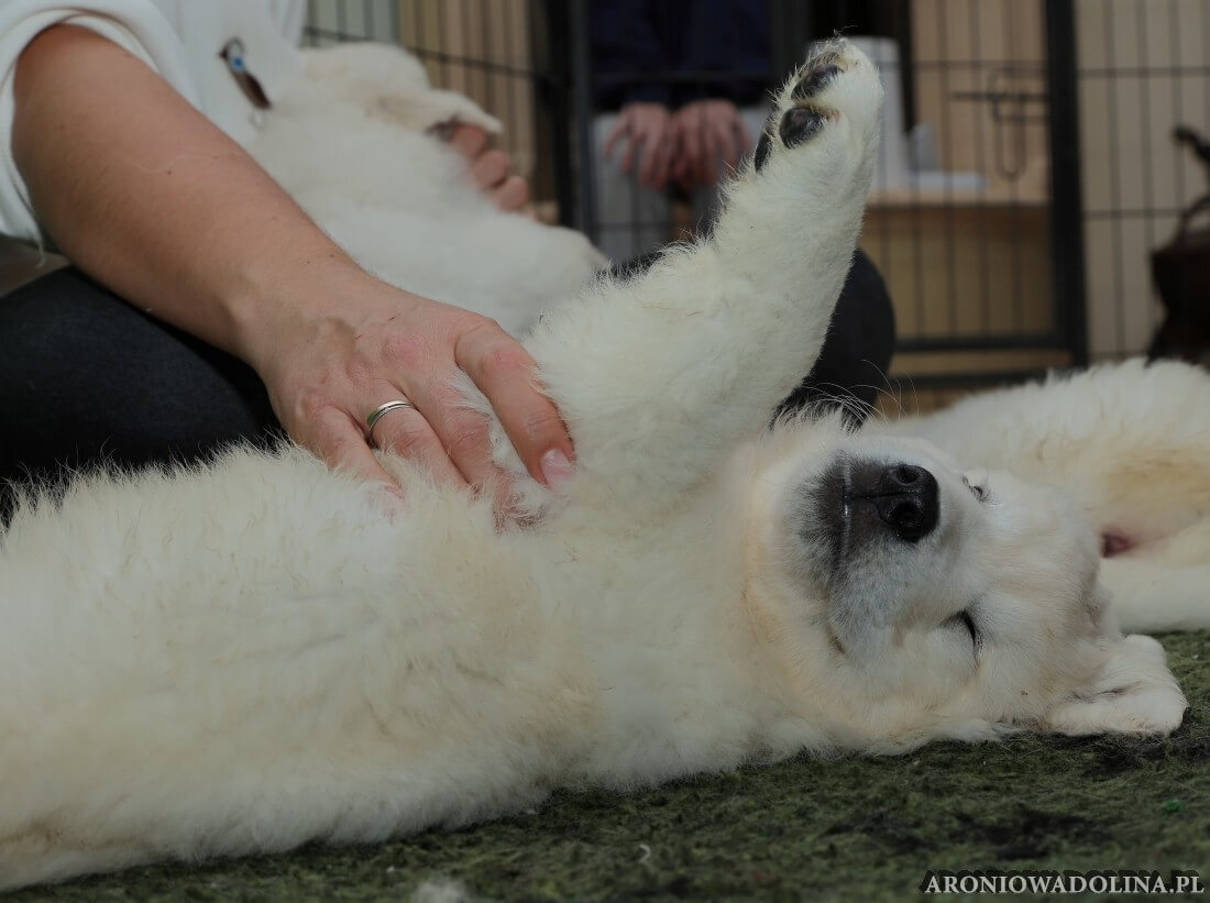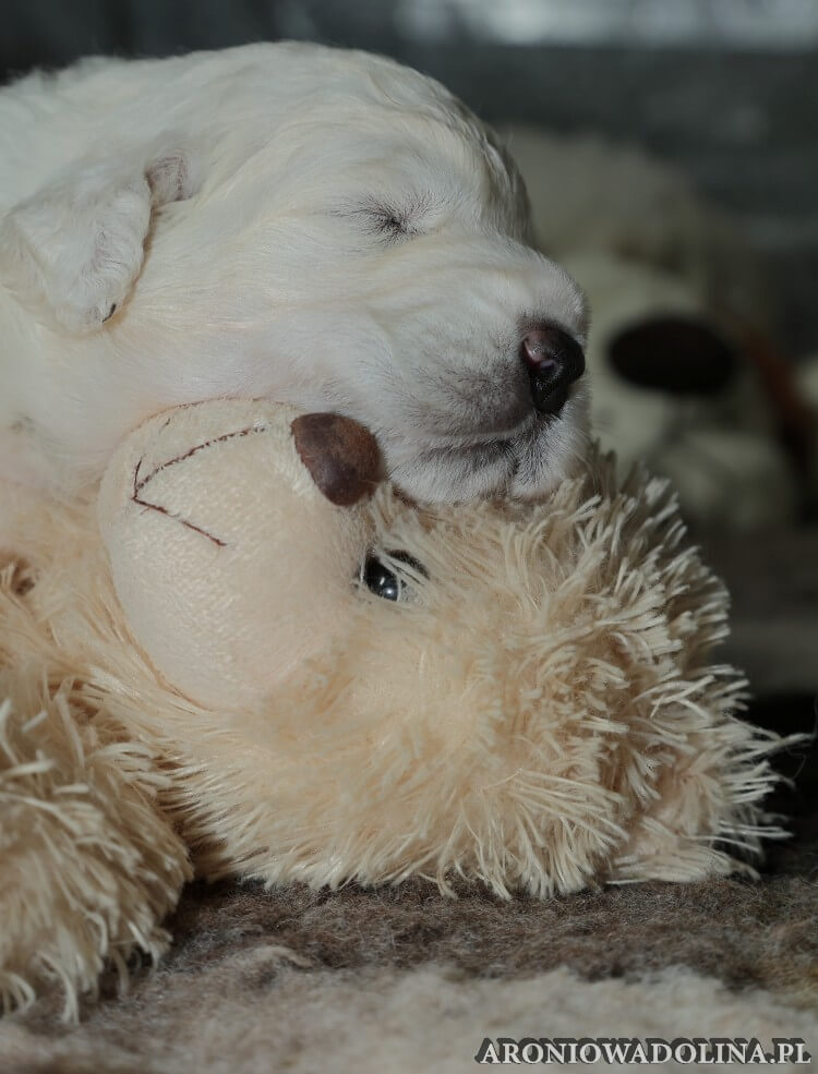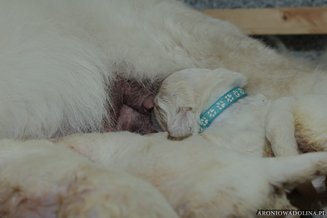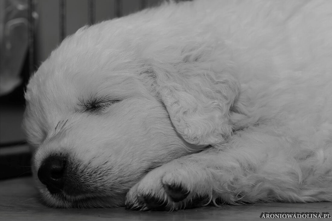 W tym czasie szczeniaki owczarka podhalańskiego głównie śpią, budzą się żeby zjeść i załatwić i znowu śpią. Piwonia okazała się bardzo czułą mamą, wylizuje maluszki, zwłaszcza brzuszki i 4-literki, ponieważ samodzielnie jeszcze nie potrafią uruchomić swoich kiszeczek. Pod koniec tego okresu szczeniaczki zaczynają lekko otwierać oczka, próbują niezdarnie chodzić na łapkach, niektóre już poszczekują. Wybarwiają się im noski. Codziennie sprawdzamy wagę maluszków żeby kontrolować ich prawidłowy rozwój. Obcinamy pazurki żeby nie raniły Piwonii w trakcie karmienia (w odróżnieniu od kotków, pieski nie potrafią ich chować). I tak wchodzimy w 3. tydzień życia.