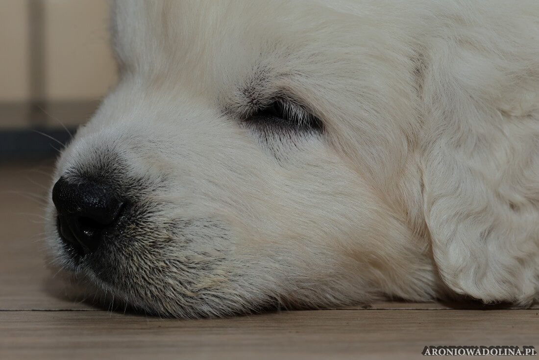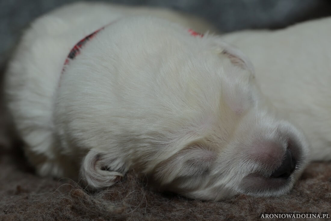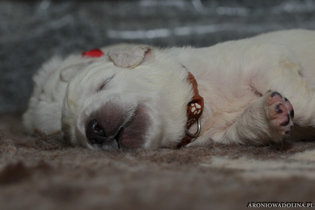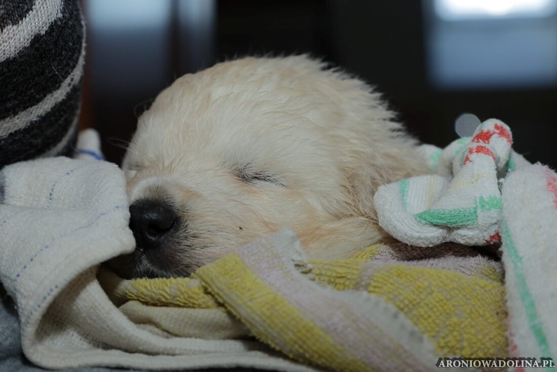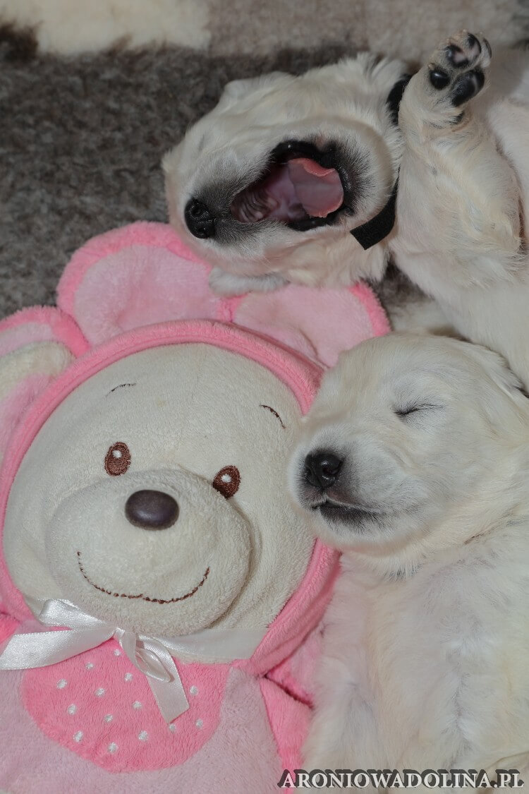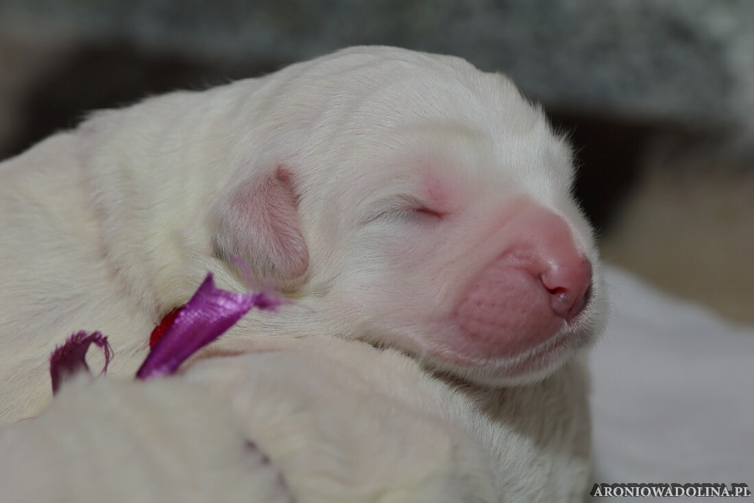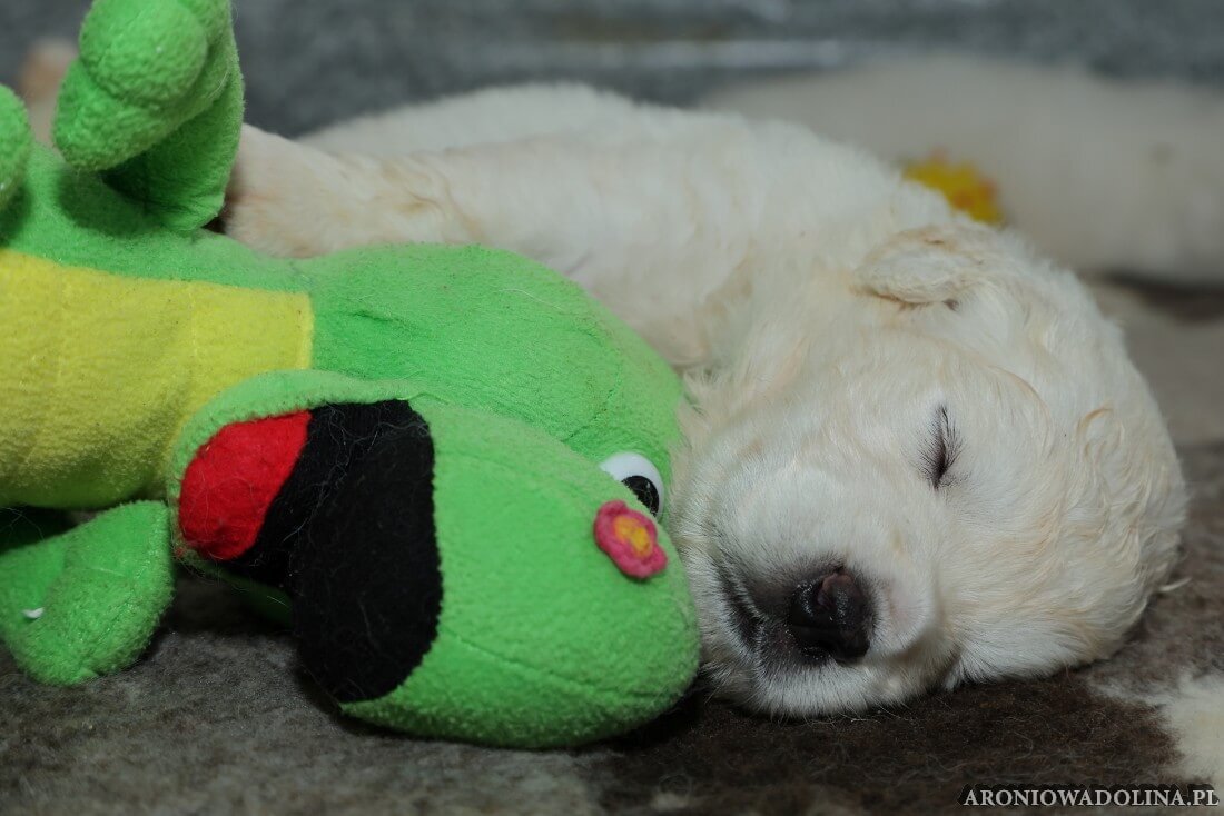 W tym czasie szczeniaki owczarka podhalańskiego głównie śpią, budzą się żeby zjeść i załatwić i znowu śpią. Piwonia okazała się bardzo czułą mamą, wylizuje maluszki, zwłaszcza brzuszki i 4-literki, ponieważ samodzielnie jeszcze nie potrafią uruchomić swoich kiszeczek. Pod koniec tego okresu szczeniaczki zaczynają lekko otwierać oczka, próbują niezdarnie chodzić na łapkach, niektóre już poszczekują. Wybarwiają się im noski. Codziennie sprawdzamy wagę maluszków żeby kontrolować ich prawidłowy rozwój. Obcinamy pazurki żeby nie raniły Piwonii w trakcie karmienia (w odróżnieniu od kotków, pieski nie potrafią ich chować). I tak wchodzimy w 3. tydzień życia.