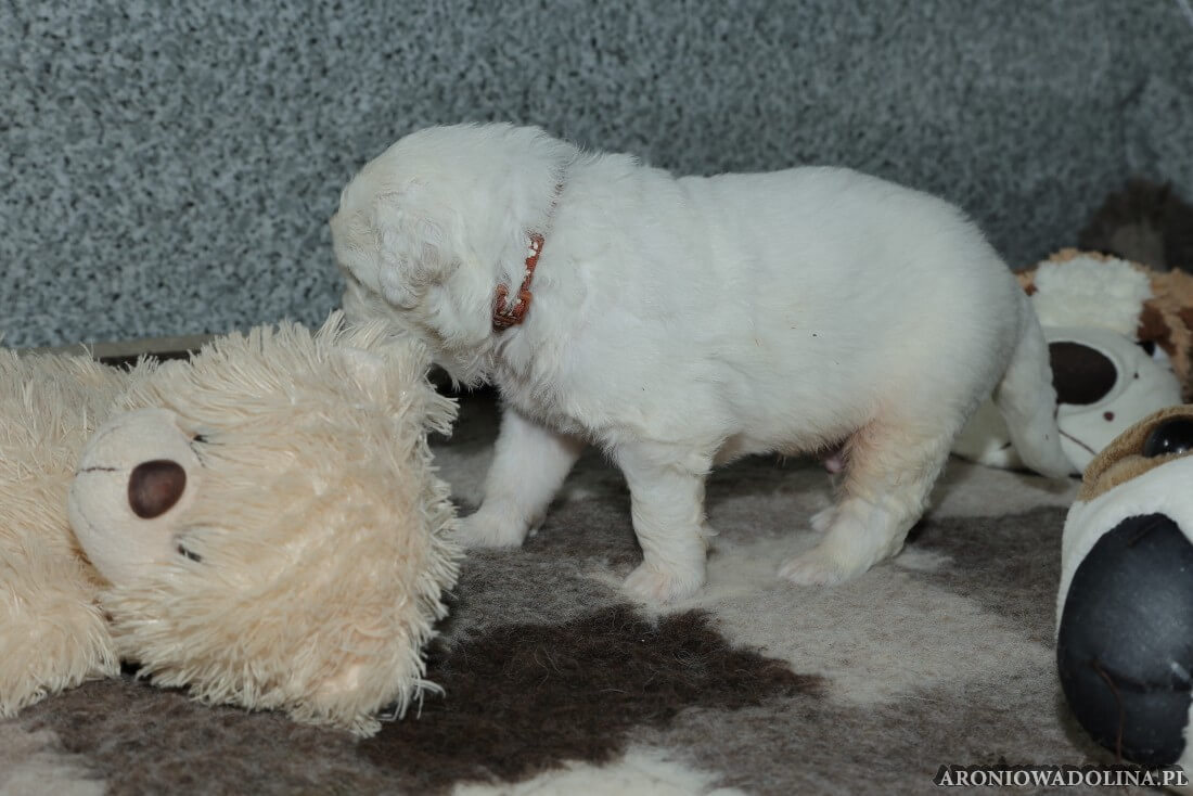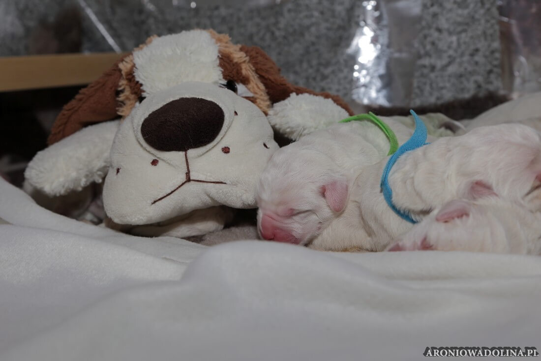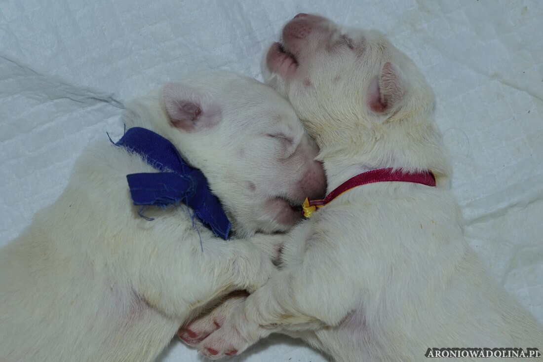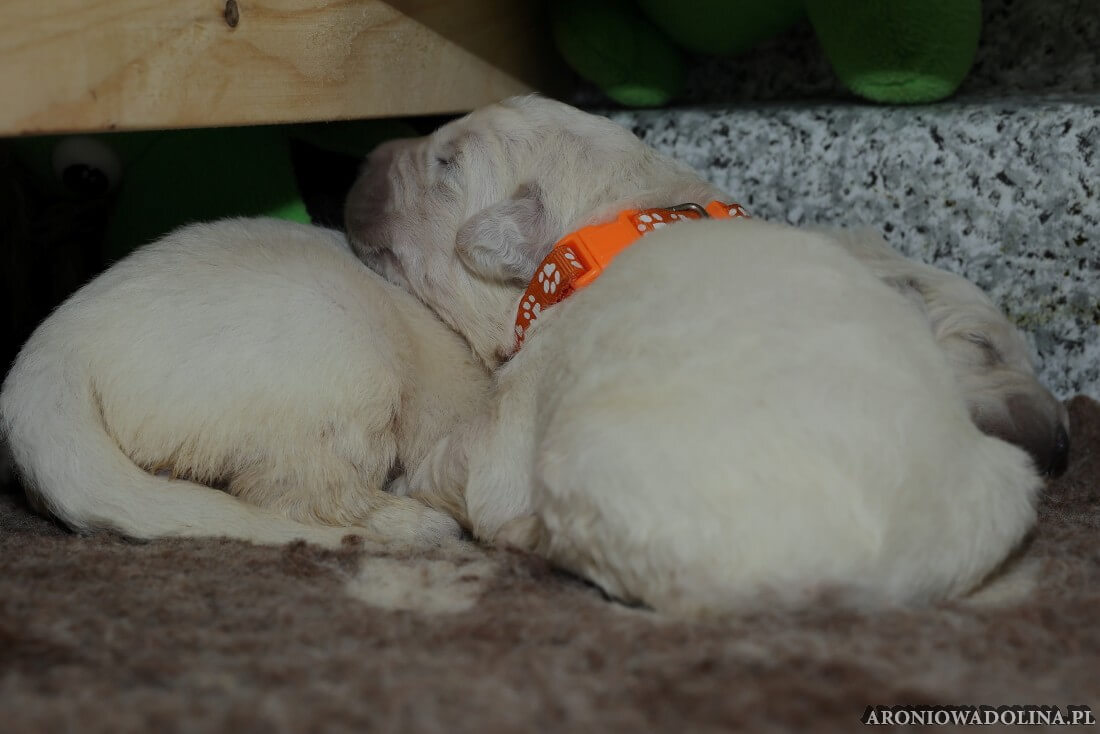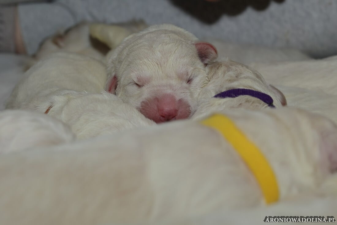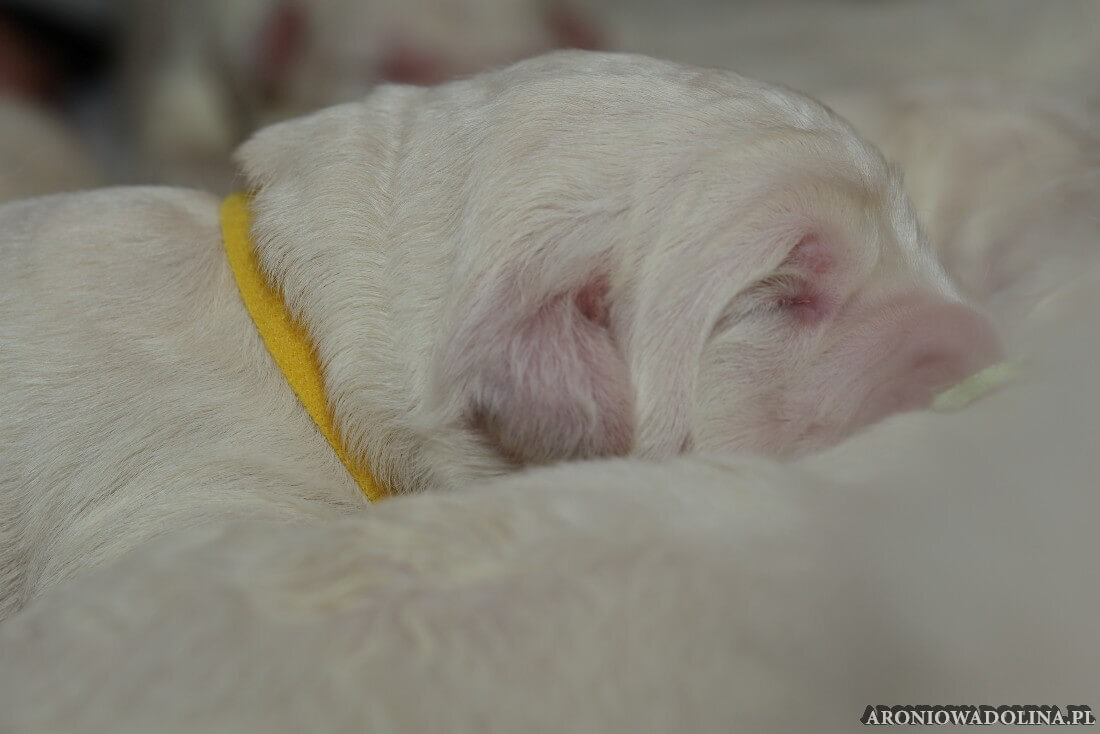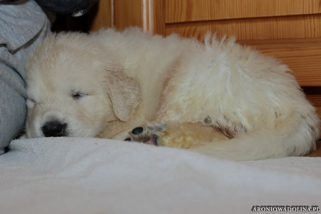 W tym czasie szczeniaki owczarka podhalańskiego głównie śpią, budzą się żeby zjeść i załatwić i znowu śpią. Piwonia okazała się bardzo czułą mamą, wylizuje maluszki, zwłaszcza brzuszki i 4-literki, ponieważ samodzielnie jeszcze nie potrafią uruchomić swoich kiszeczek. Pod koniec tego okresu szczeniaczki zaczynają lekko otwierać oczka, próbują niezdarnie chodzić na łapkach, niektóre już poszczekują. Wybarwiają się im noski. Codziennie sprawdzamy wagę maluszków żeby kontrolować ich prawidłowy rozwój. Obcinamy pazurki żeby nie raniły Piwonii w trakcie karmienia (w odróżnieniu od kotków, pieski nie potrafią ich chować). I tak wchodzimy w 3. tydzień życia.