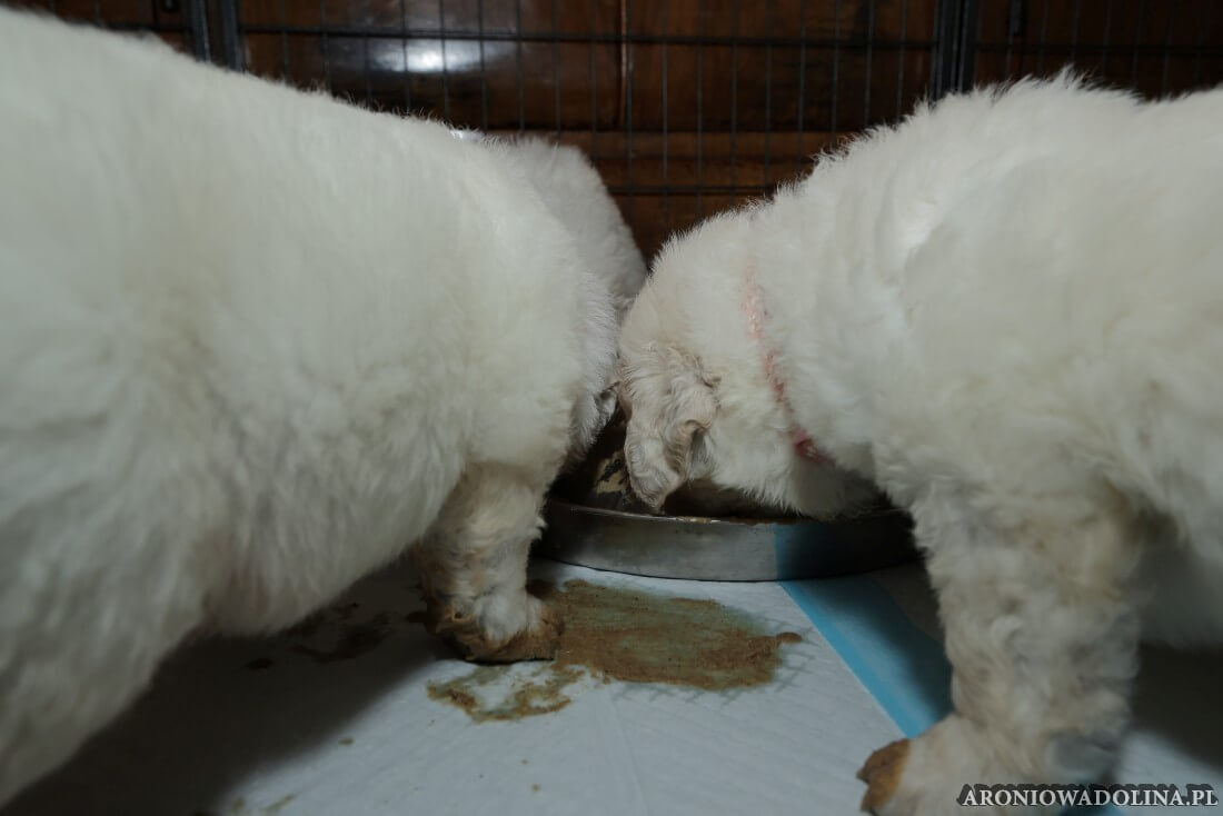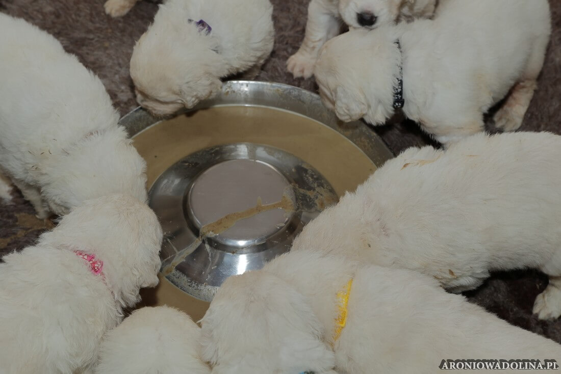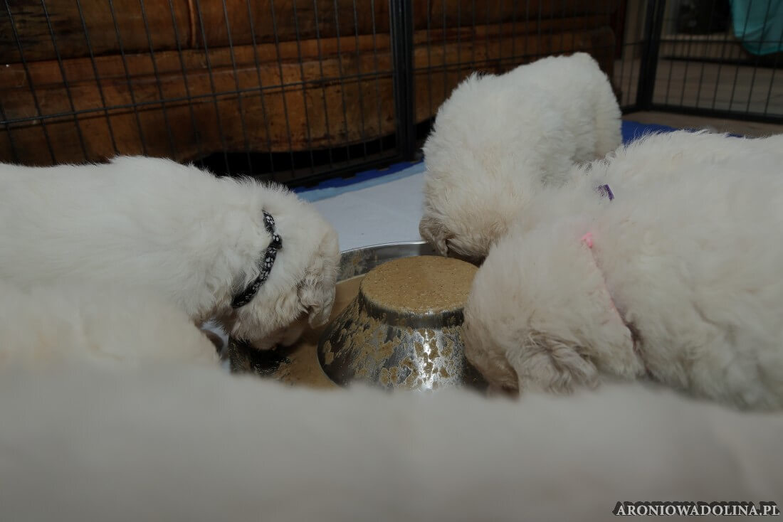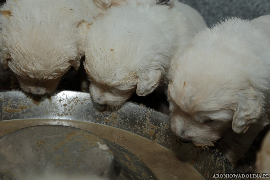 W tym okresie widać już dynamiczne zmiany w ich rozwoju. Szczeniaczkom obcinamy po raz pierwszy pazurki, żeby nie raniły Piwonii w trakcie karmienia. Maluszki zaczynają widzieć i słyszeć, zaczynają zakręcać się im ogonki, uszka z pionowego ułożenia (jak pióro w czapce góralskiej) opadają i wyglądają już jak u prawdziwych podhalanów. Po raz pierwszy w swoim życiu jedzą mięso wołowe (na tatar). Pierwszy raz są odrobaczane (w tym reszta stada, nawet kot Czarek ). Zaczynają im rosnąć ząbki jak szpileczki, lecz Piwonia z matczyną cierpliwością dalej je karmi. Oprócz mleka zaczynają też jeść rozmoczoną karmę suchą dla szczeniaczków. Mają też pierwsze w swoim życiu SPA