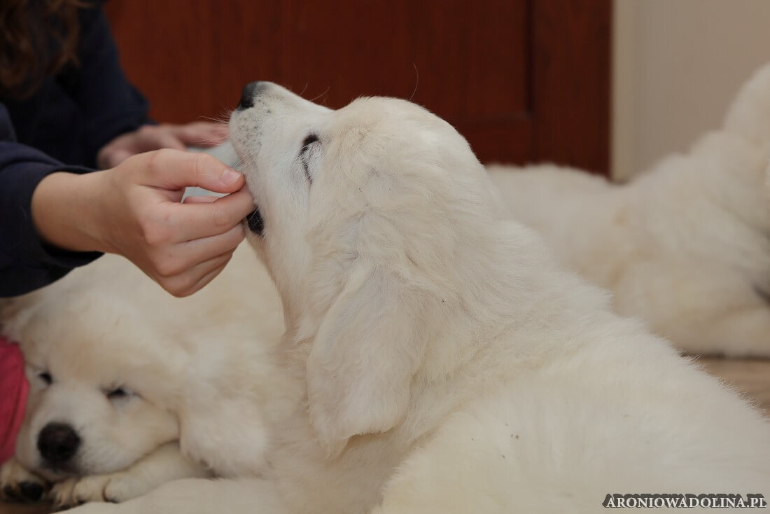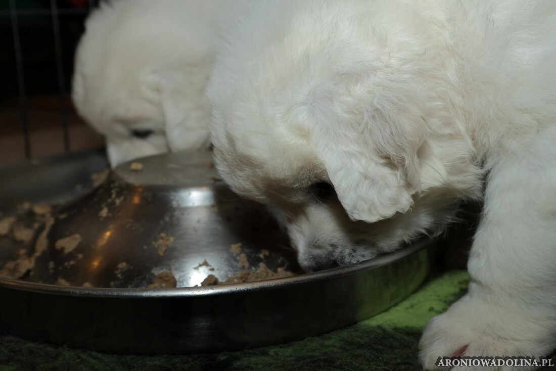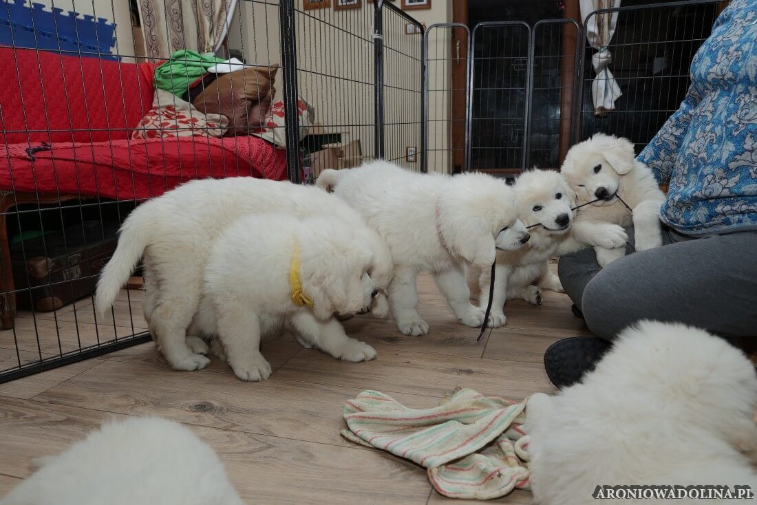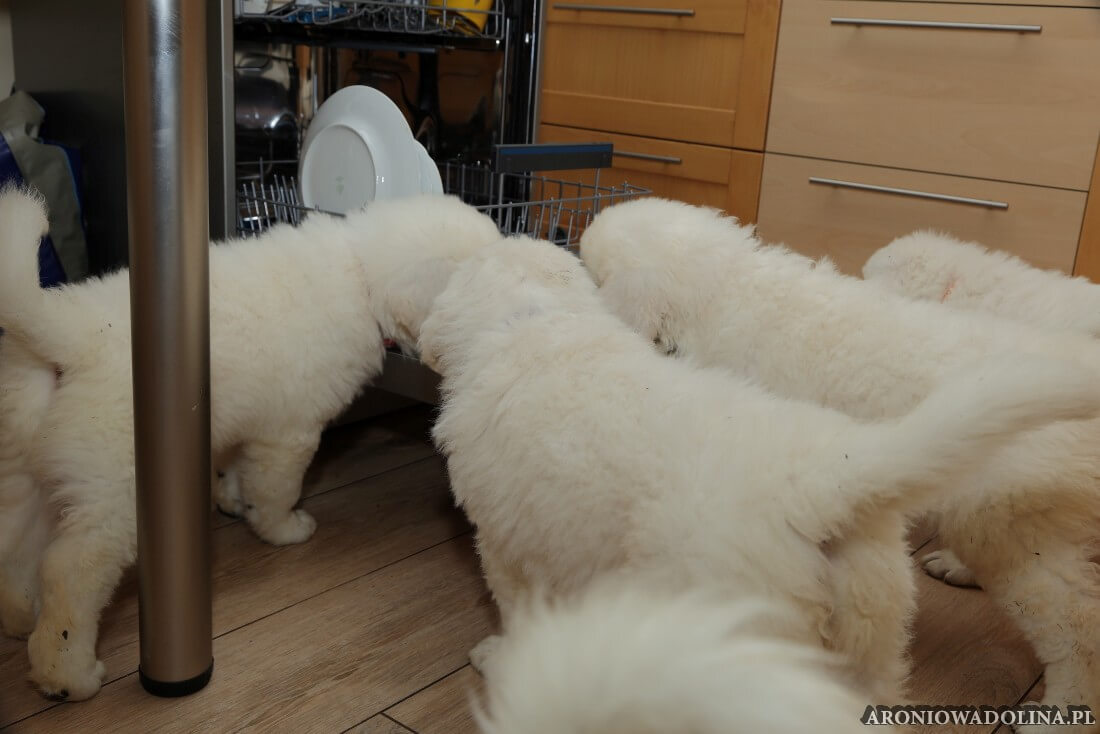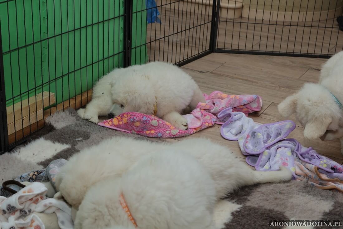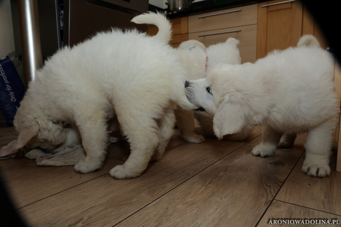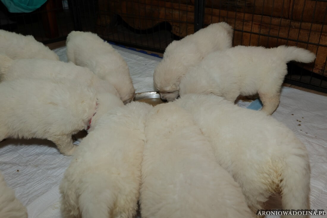 W tym okresie maluszki opuszczają kojec i zamieszkują na dużo większej przestrzeni w dużym pokoju. Piją już wodę z siemieniem lnianym i jedzą (jako przystawkę) suchą karmę. Szczeniaki owczarka podhalańskiego szczepimy, czipujemy i po raz kolejny odrobaczamy. Maluchy coraz bardziej dopominają się naszej uwagi, zabawy, pieszczot… Ząbki mają już ostre jak brzytwa i piłują nimi co tylko mogą, w tym bardzo chętnie nas