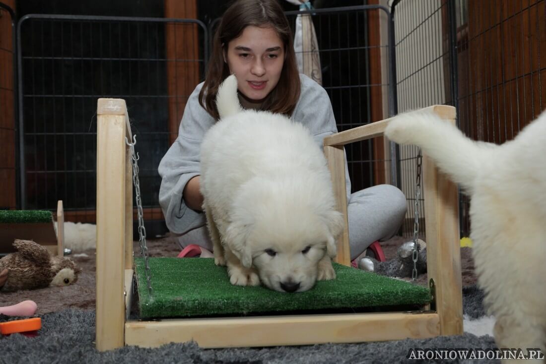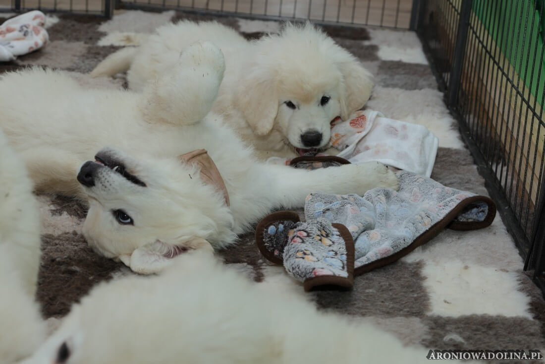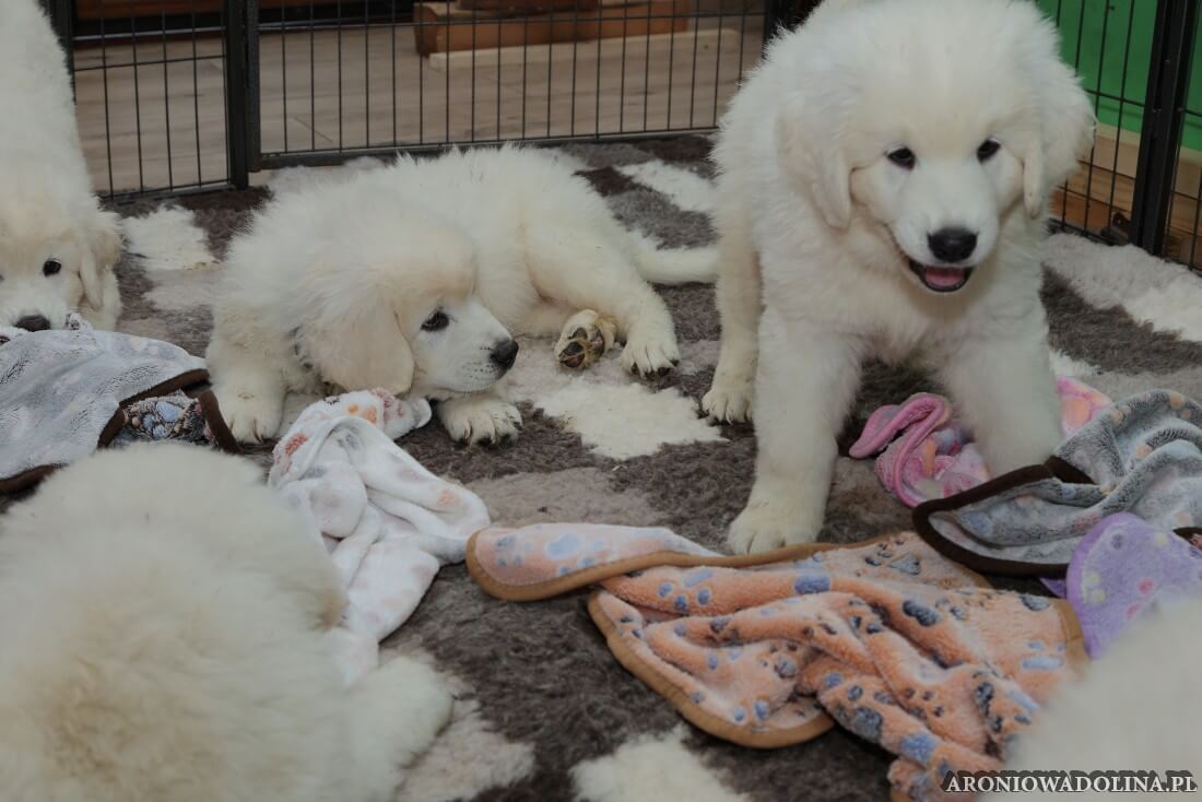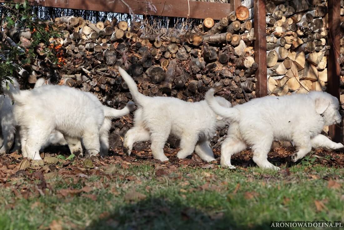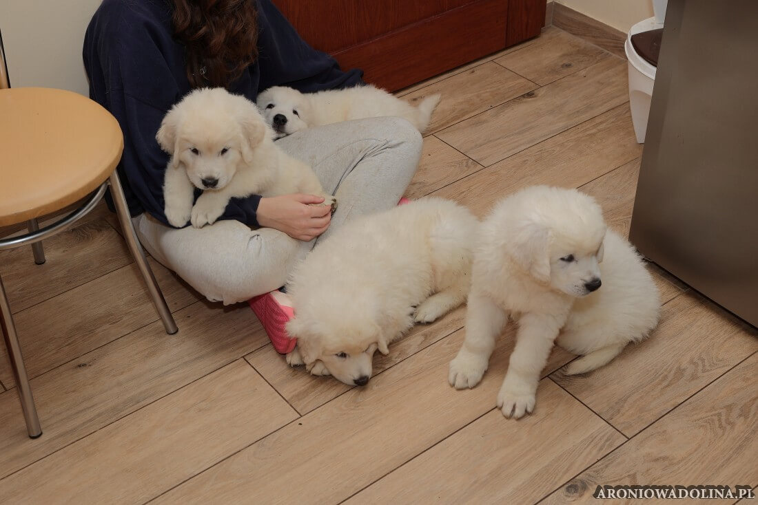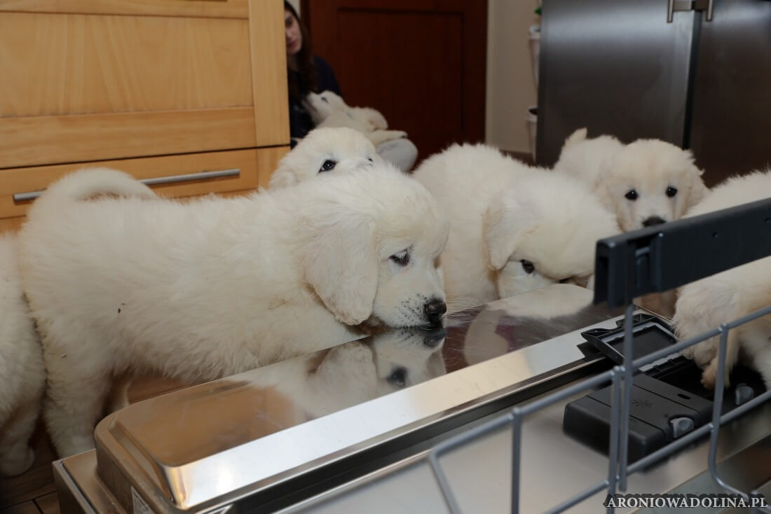 W tym okresie maluszki opuszczają kojec i zamieszkują na dużo większej przestrzeni w dużym pokoju. Piją już wodę z siemieniem lnianym i jedzą (jako przystawkę) suchą karmę. Szczeniaki owczarka podhalańskiego szczepimy, czipujemy i po raz kolejny odrobaczamy. Maluchy coraz bardziej dopominają się naszej uwagi, zabawy, pieszczot… Ząbki mają już ostre jak brzytwa i piłują nimi co tylko mogą, w tym bardzo chętnie nas