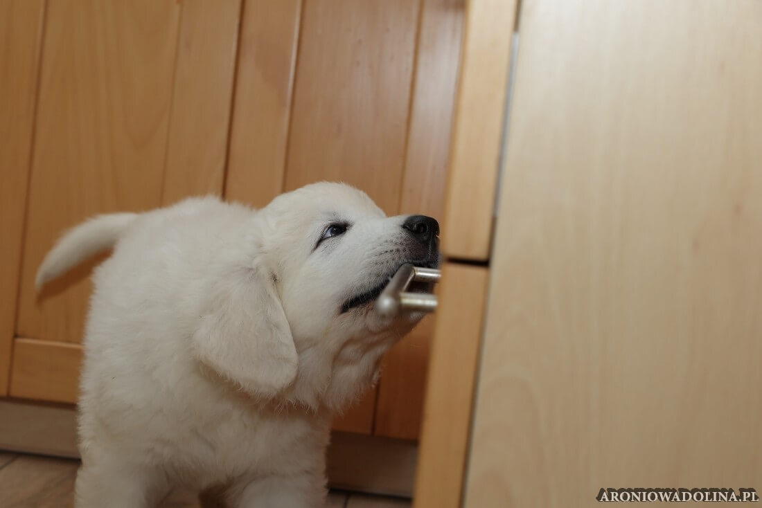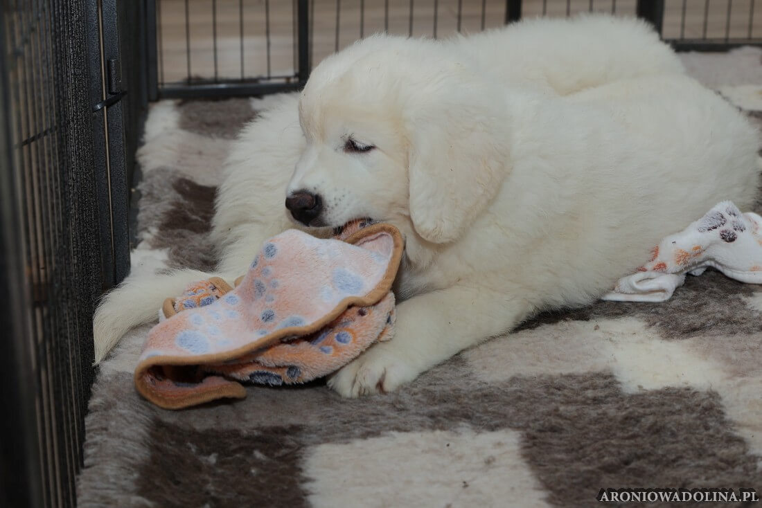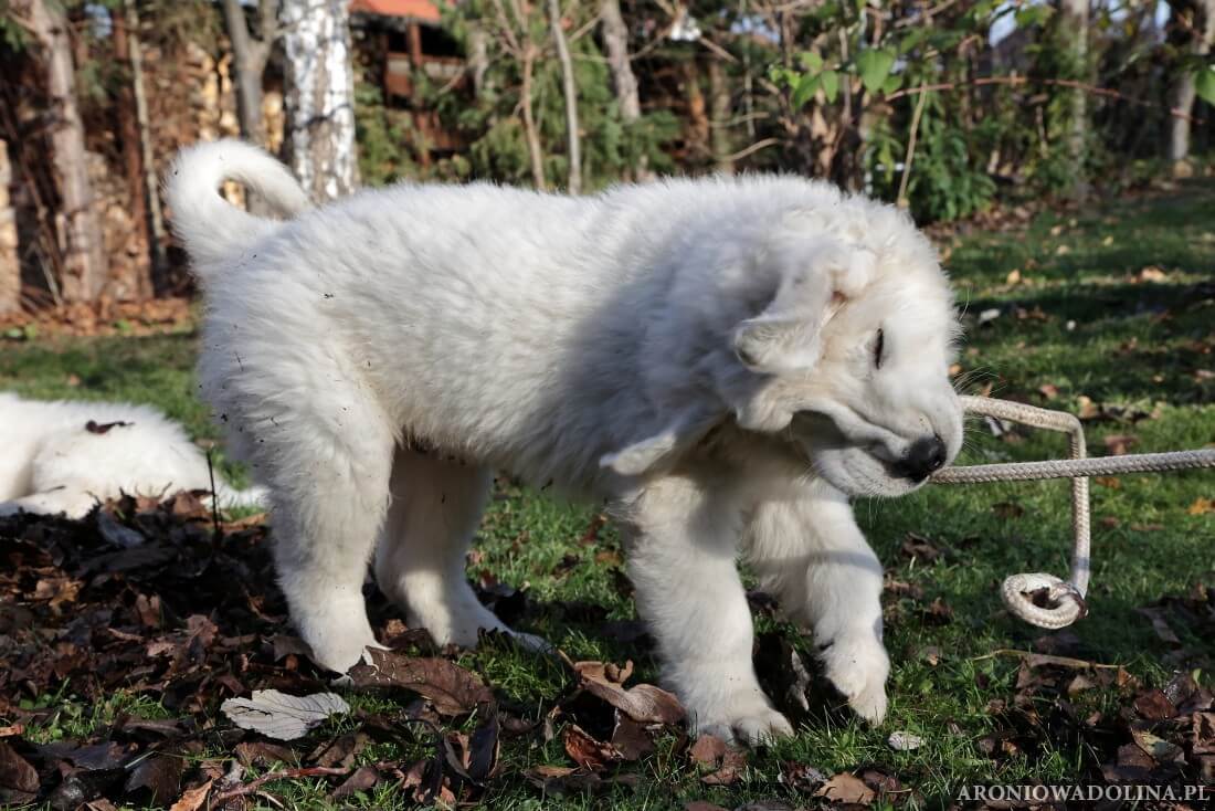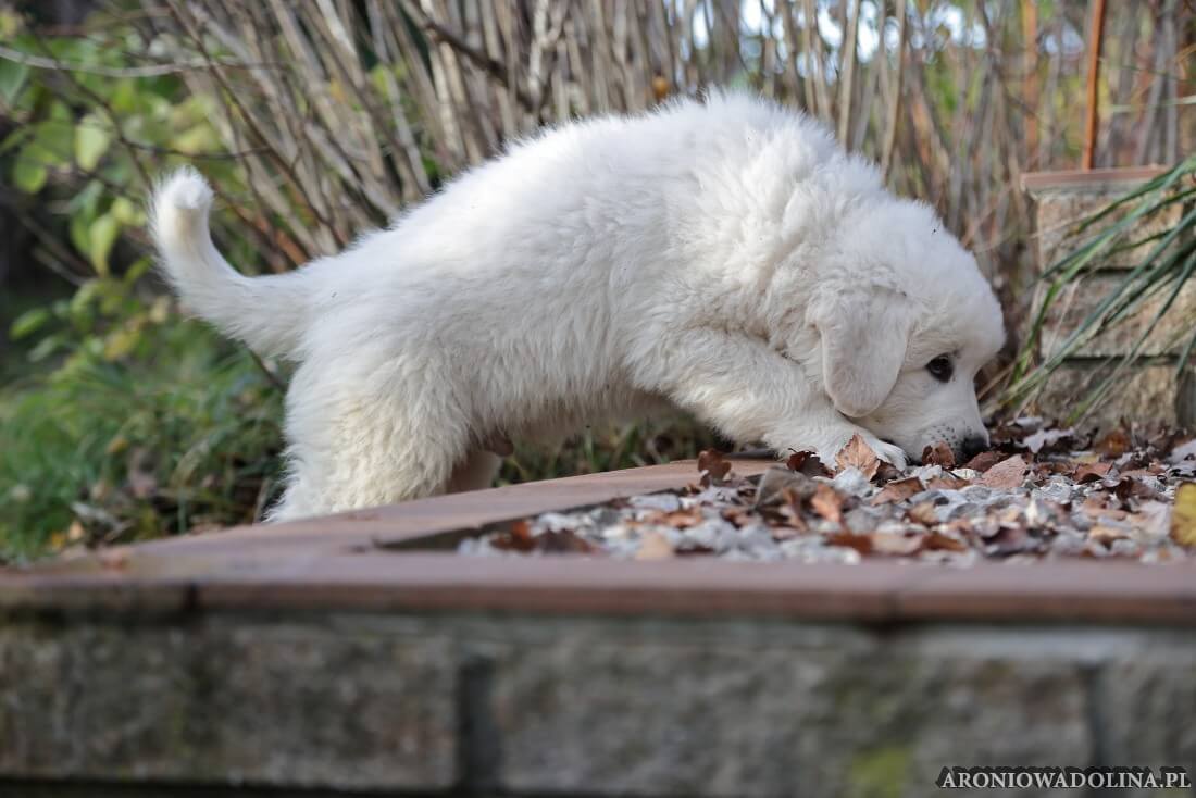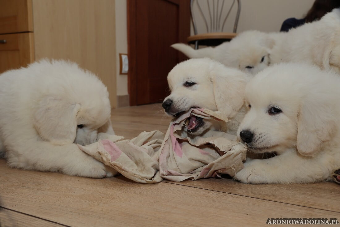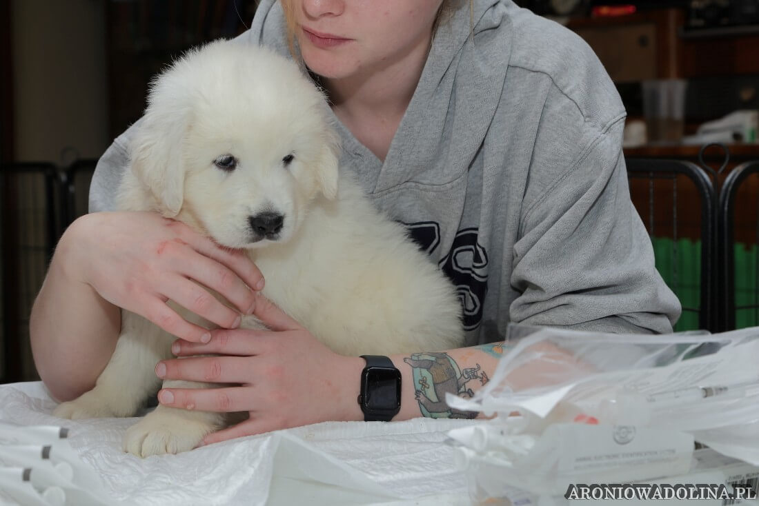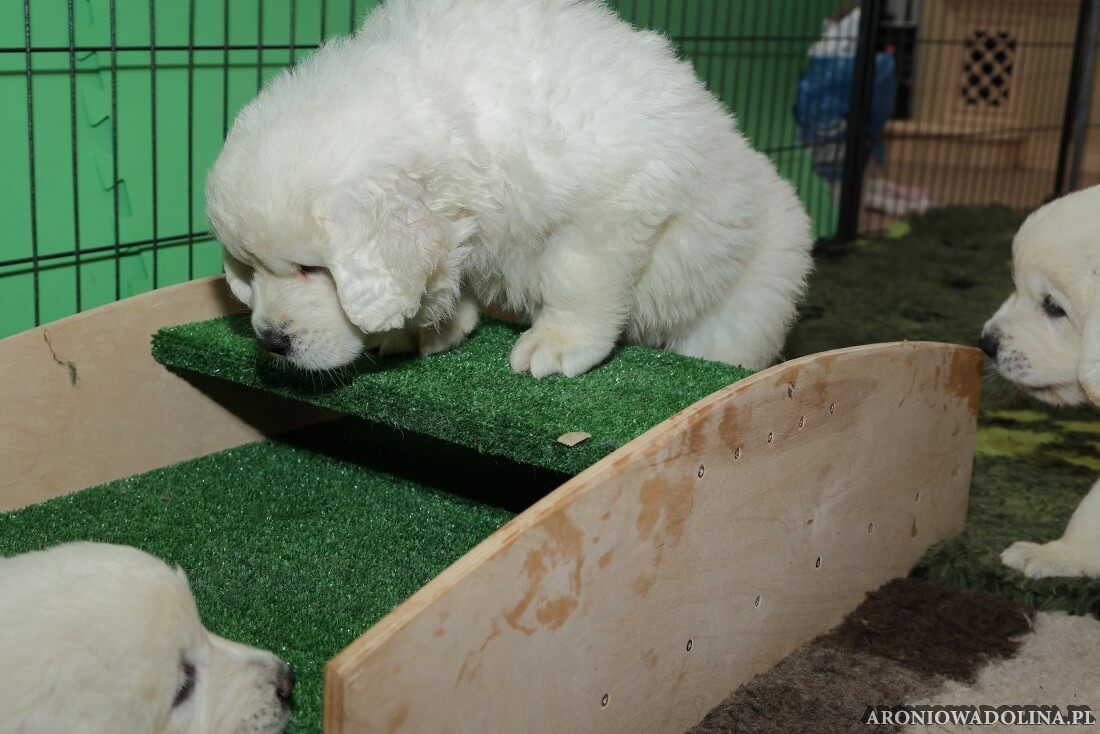 W tym okresie maluszki opuszczają kojec i zamieszkują na dużo większej przestrzeni w dużym pokoju. Piją już wodę z siemieniem lnianym i jedzą (jako przystawkę) suchą karmę. Szczeniaki owczarka podhalańskiego szczepimy, czipujemy i po raz kolejny odrobaczamy. Maluchy coraz bardziej dopominają się naszej uwagi, zabawy, pieszczot… Ząbki mają już ostre jak brzytwa i piłują nimi co tylko mogą, w tym bardzo chętnie nas
